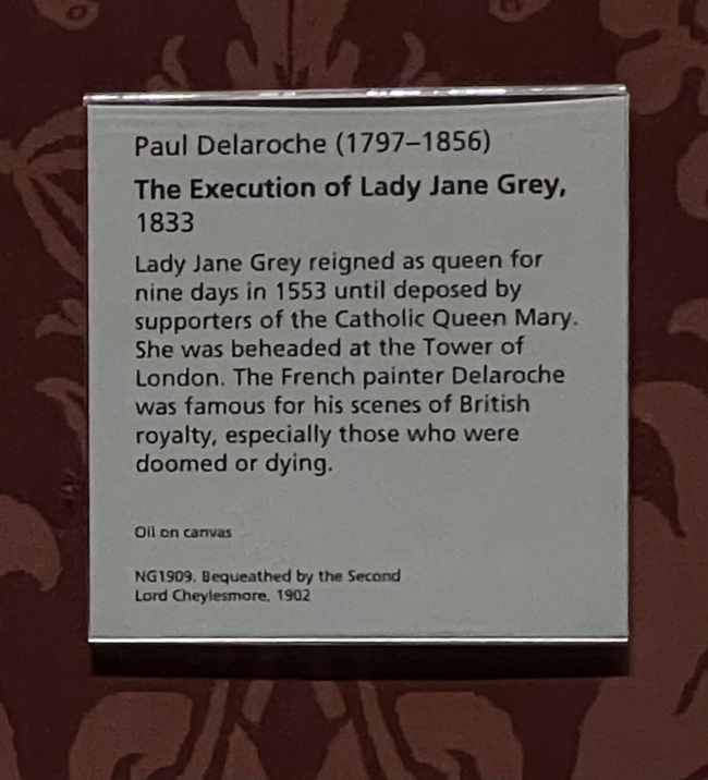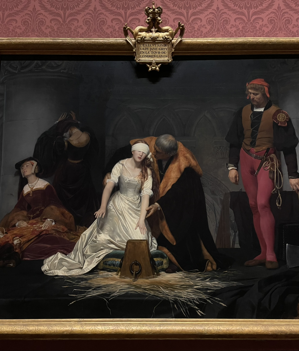 Lady Jane Grey(제인 그레이)의 처형 장면을 그린 이 작품은 프랑스 화가 Paul Delaroche(폴 들라로슈)의 것으로, 그는 영국 왕실의 파멸이나 죽음의 순간들을 그리는 것으로 유명했다고 한다. 그림 속의 제인 그레이는 1553년 단 9일 동안 영국 여왕으로 재임하였으나 가톨릭 여왕 메리 1세의 지지자들에 의해 폐위되어 Tower of London(런던타워)에서 참수되었다고 한다.