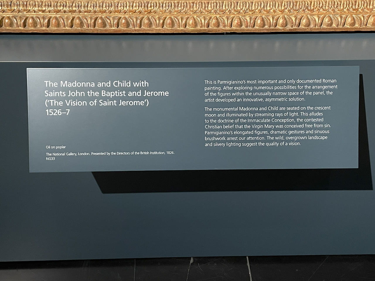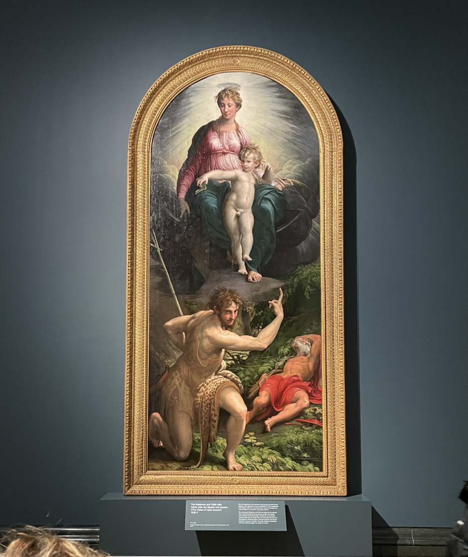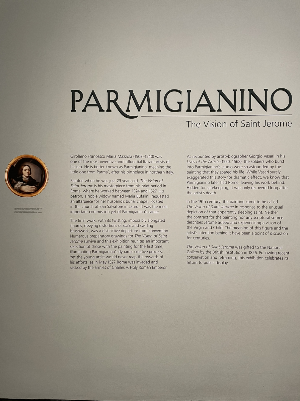 전시장 한편에 'PARMIGIANINO'라는 이름의 기획 공간이 마련되어 있고, 아래와 같이 큰 규모의 홀리한 그림이 전시되어 있었다. 안내문에 의하면 Parmigianino는 Girolamo Francesco Maria Mazzola라는 당대 유명한 이탈리아 예술가의 별칭(활동명)이고, 그가 23세였던 1526년에 로마에서의 활동기간 동안 <성 제롬의 환시>를 제작한 것이 바로 이그림이라고 한다. 이 작품은 그의 후원자였던 Maria Bufalini 여사가 남편의 묘소를 장식하기 위해 요청한 제단화로, San Salvatore 교회에 설치될 예정이었고 이는 그의 경력에서 중요한 의뢰 중 하나였다고 한다. 작품에서 찾아볼 수 있는 비틀린 형태와 과장된 비례, 혼란스러운 원근법, 소용돌이치는 붓질 등은 전통적 규범에서 탈피한 그만의 독특한 화풍을 나타내고 있단다.