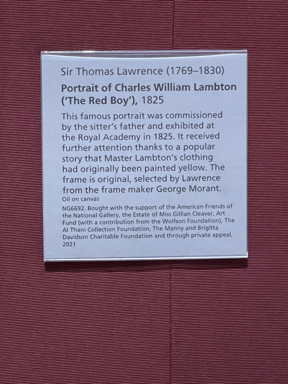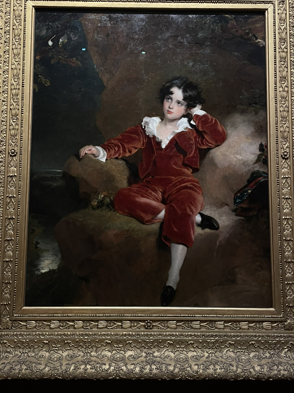 아주 예쁜 얼굴을 한 소년을 그린 이 작품은 Sir Thomas Lawrence(토마스 로렌스 경)의 <찰스 윌리엄 램턴의 초상(붉은 소년)>으로, 그림 속 소년의 아버지에 의해 의뢰되어 그려졌고 1825년 왕립 아카데미에 전시되었다고 한다. 또한, 소년의 의상이 원래 노란색으로 그려졌었다는 이야기 덕분에 이 작품은 사람들로부터 더 주목받았다고 한다.