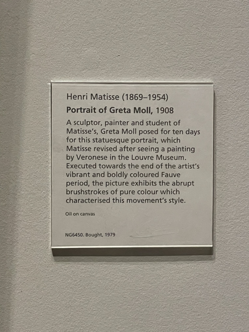 이 그림은 야수파의 대표 작가 중 한 명인 Henri Matisse(앙리 마티스)의 <그레타 몰의 초상>. Greta Moll은 조각가이자 화가였고 마티스의 제자이기도 했단다. 에메랄드빛 색채와 대담한 붓터치가 Moll의 당당한 포즈와 잘 어우러진다.