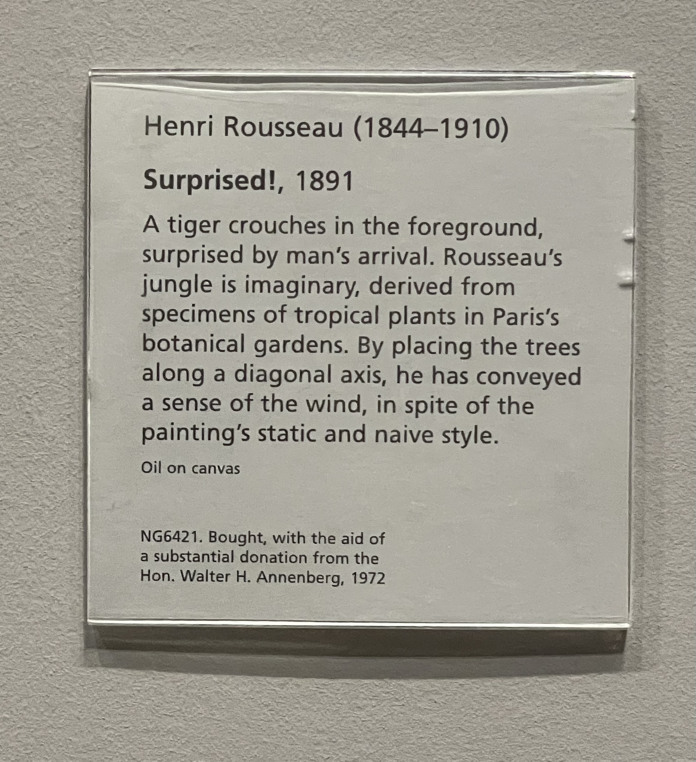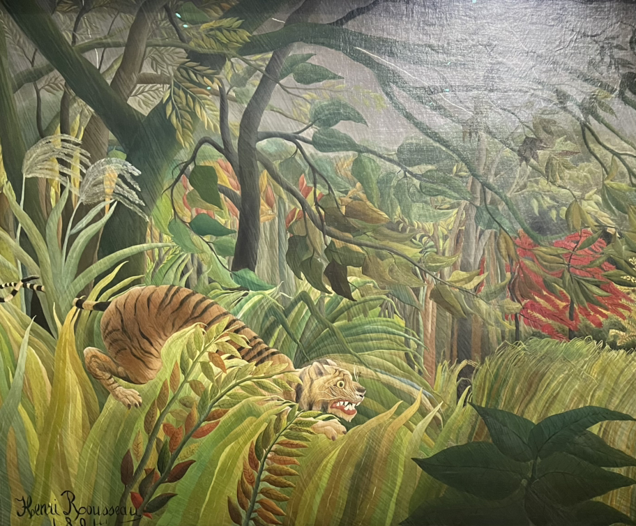 Henri Rousseau(앙리 루소)의, <Surprised!>라는 제목이 재미있는 이 작품은 이름 그대로 호랑이가 놀라는 모습을 그리고 있다. 바람의 느낌을 전할 수 있도록 나무들을 대각선 방향으로 그려냈단다.