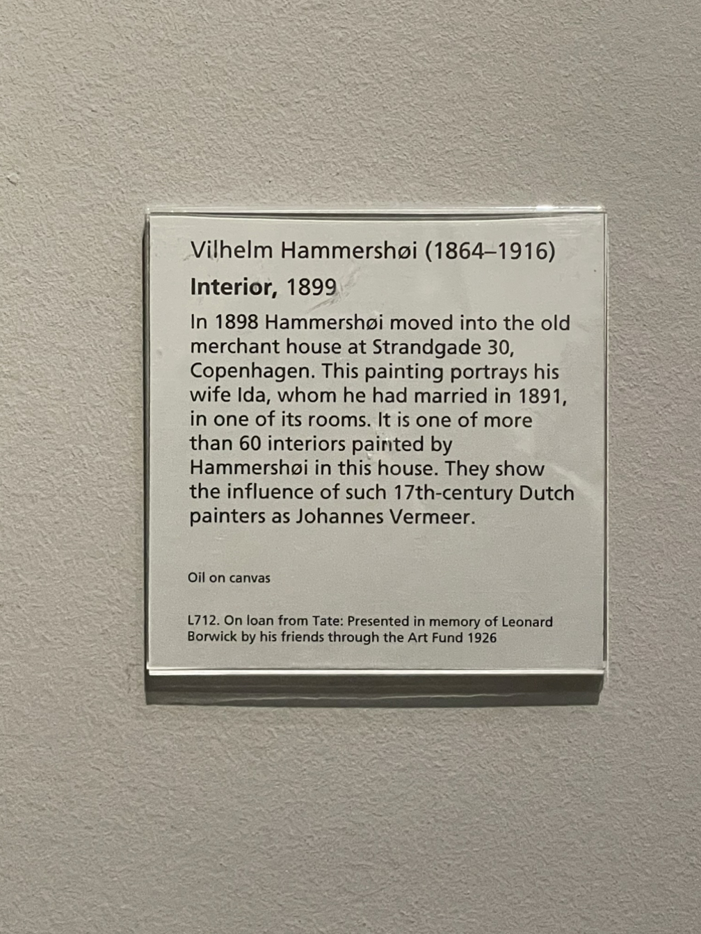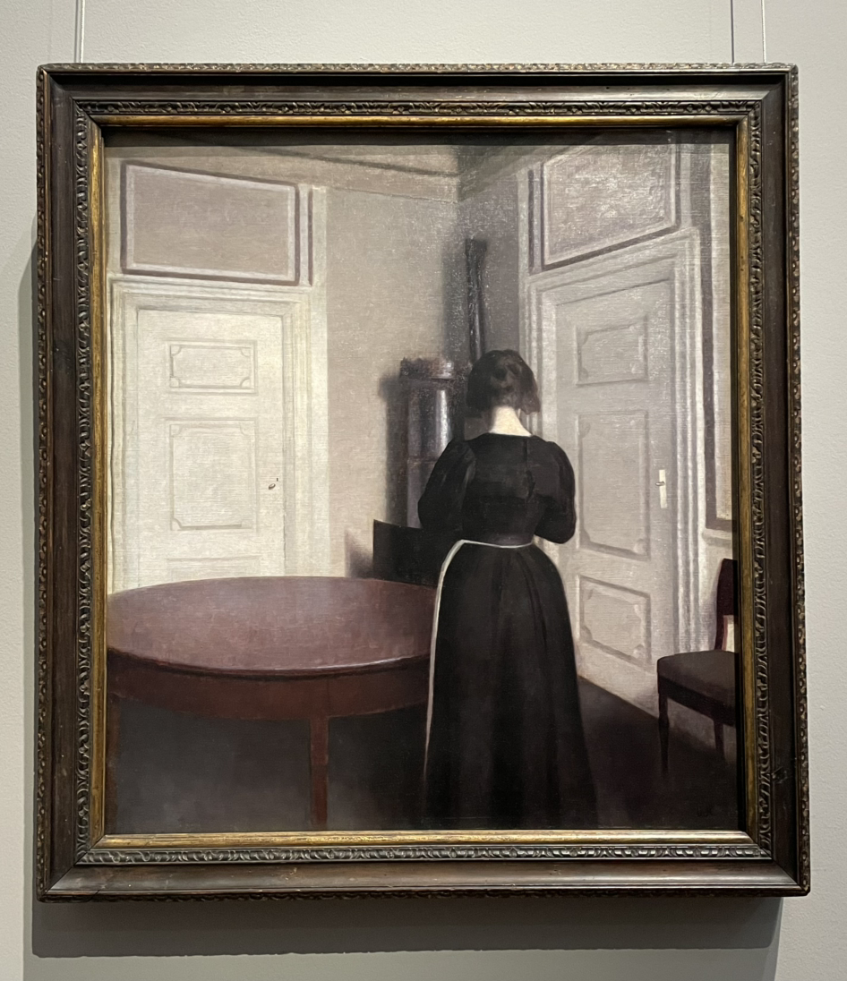 굿즈로든 무엇이든 한 번쯤 봤을 법한 Vilhelm Hammershoi의 작품. 이 그림은 코펜하겐에 있는 작가의 집 내부를 묘사하고 있다. 그에게 깊은 의미를 지니고 있는 이 집에서 그는 60점 이상의 실내 장면을 그렸다고 한다. 절제된 색조와 단순한 구성이 돋보이는 화풍은 17세기 네덜란드 화가 Johannes Vermeer(요하네스 베르메르)의 영향을 받았단다.