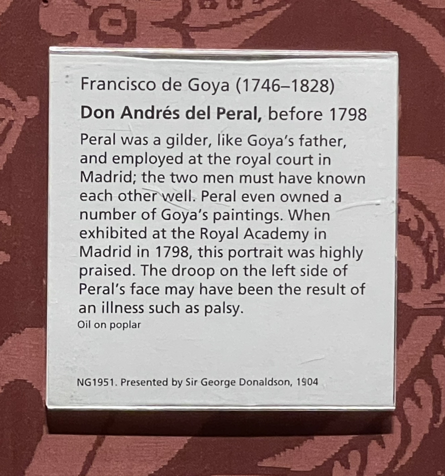 스페인을 대표하는 화가 중 한 명인 Francisco de Goya(프란시스코 데 고야)의 이 작품은 고야의 아버지와 같이 금박공이었던 <Don Andres del Peral>이라는 인물을 그렸으며, Peral(페랄)은 마드리드 왕실에 고용되어 일했고, 고야와 친분이 있었을 뿐 아니라 고야의 그림들을 소장하기도 했단다. 페랄의 왼쪽 얼굴이 처진 것처럼 보이는 이유는 중풍과 같은 질병의 결과일 수 있다고 한다. 또한, 이 작품은 1798년 마드리드 왕립 아카데미 전시회에서 높은 평가를 받았다고 한다.