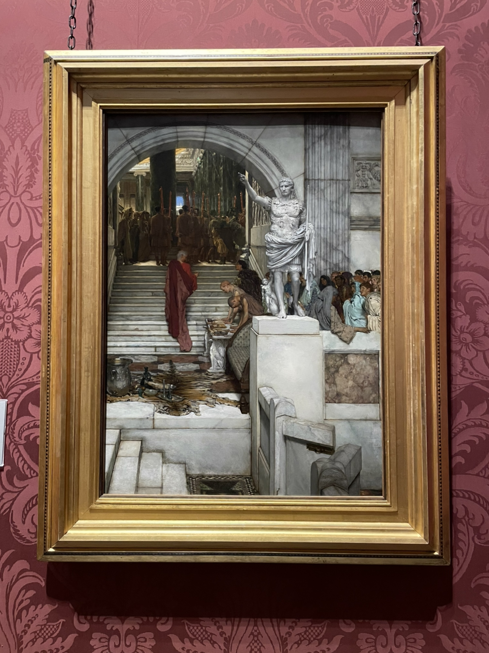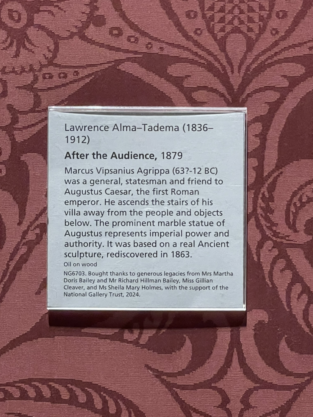 그림의 구도가 인상적인 이 그림은 Lawrence Alma-Tadema(로렌스 알마-타데마)의 <알현 후>라는 작품으로, 고대 로마를 배경으로 하여 초대 로마 황제 아우구스투스의 사위이자 측근인 마르크스 빕사니우스 아그리파가 계단을 오르는 모습을 그리고 있다. 그림 속 아우구스투스의 대리석 조각상은 권력과 권위를 상징하고 있다.