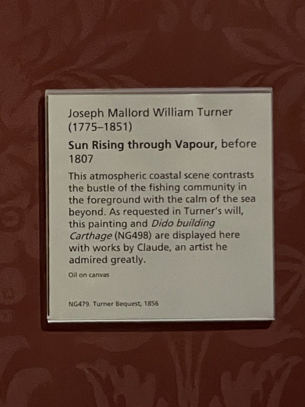 마지막으로, 영국인들이 사랑하는 화가 Joseph Mallord William Turner(윌리엄 터너)의 <안개를 뚫고 떠오르는 태양>이다. 그림 전경의 분주한 어부들의 모습과 그 너머 고요한 바다가 대조적으로 묘사되고 있다. 터너의 유언에 따라, 이 작품과 그의 또 다른 작품 <카르타고를 건설하는 디도>는 그가 매우 존경했던 화가 Claude(클로드 로랭)의 작품들과 함께 전시되고 있단다.