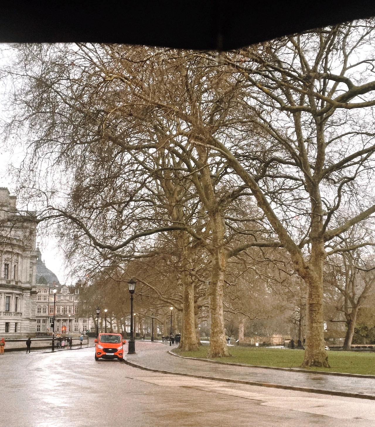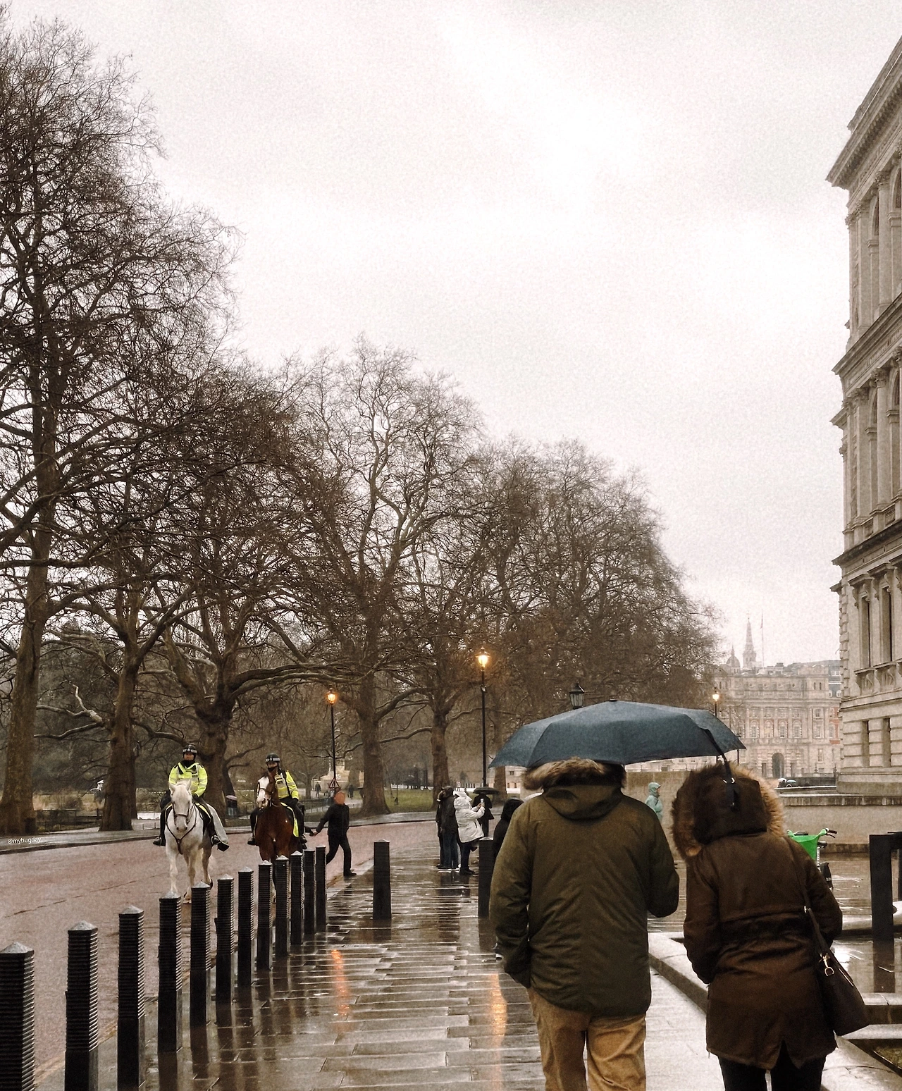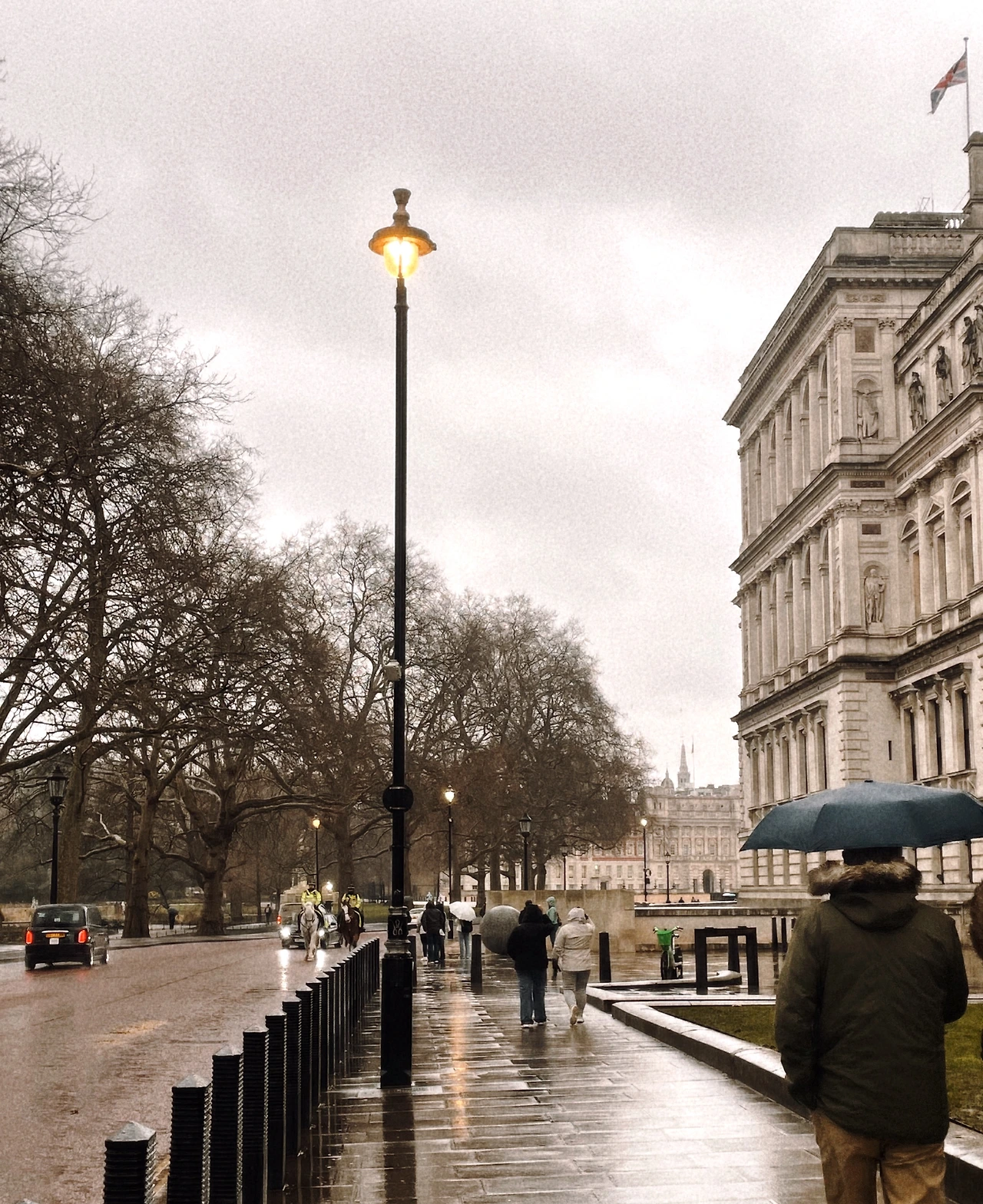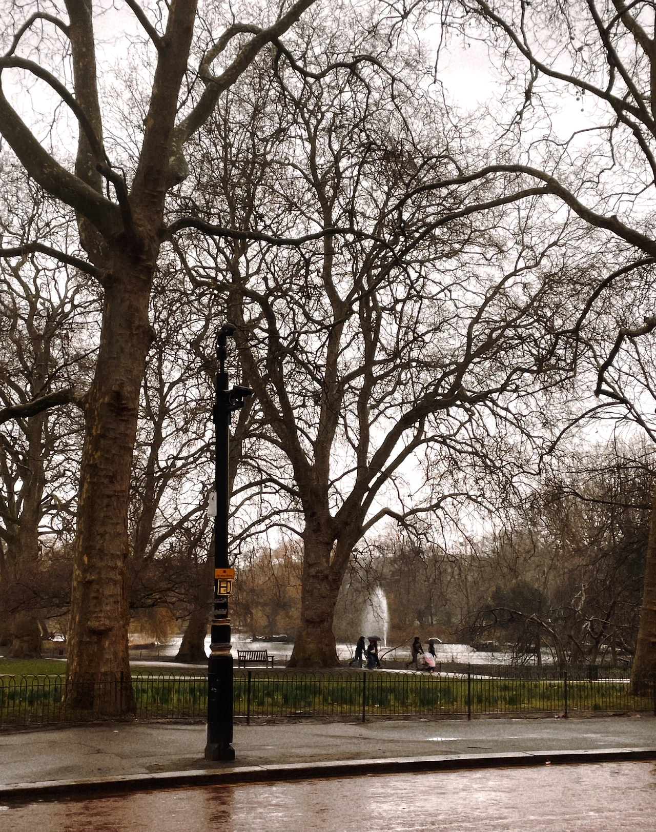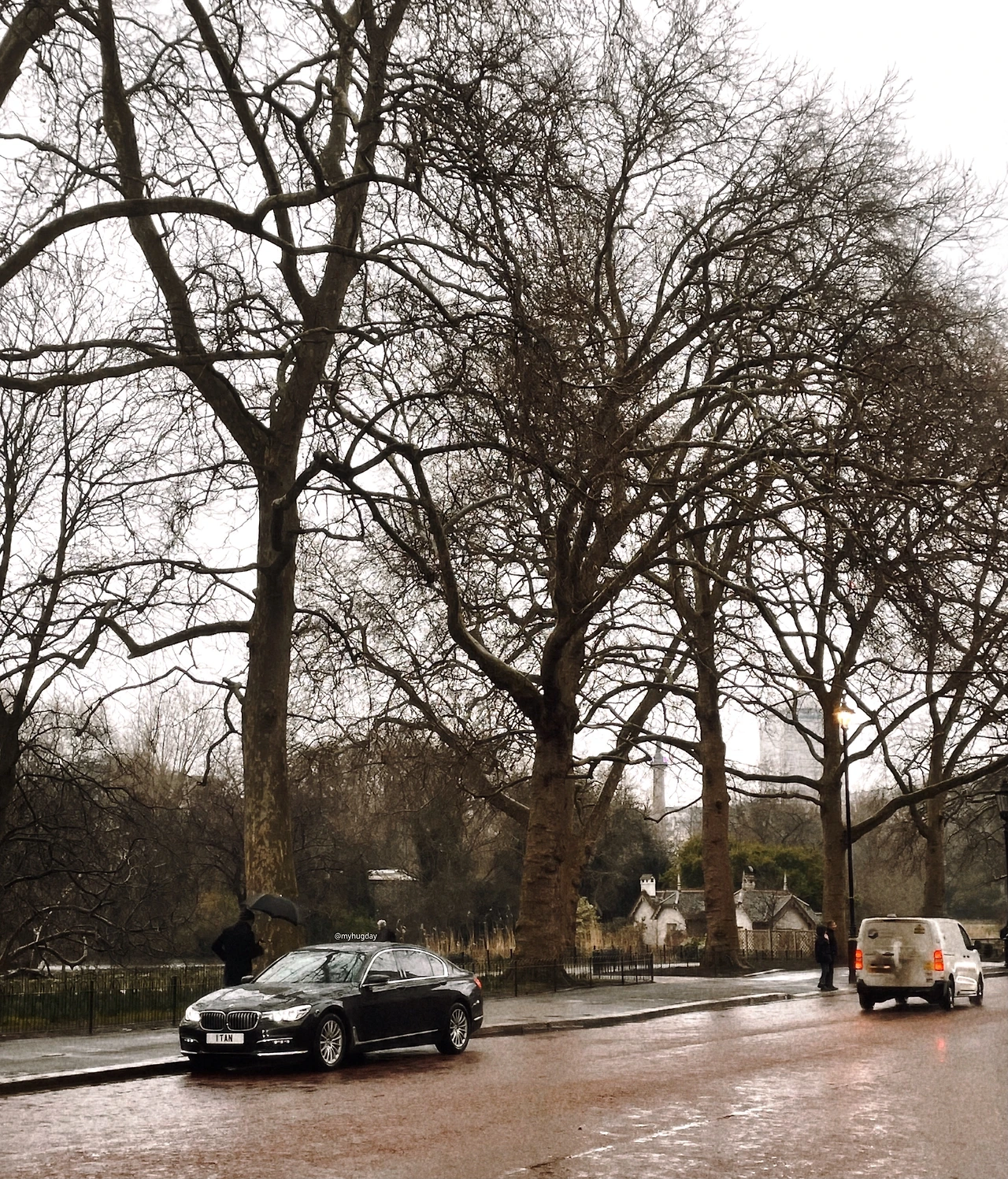 그래도 오늘은 나름대로 런던치곤 비가 꽤 많이 내리는 날이라 평소 같았으면 거들떠보지도 않았을 우산을 쓰고 나왔다. 추적추적 비 내리는 St. James Park(세인트제임스파크)를 지나 터벅터벅 걸어간다.