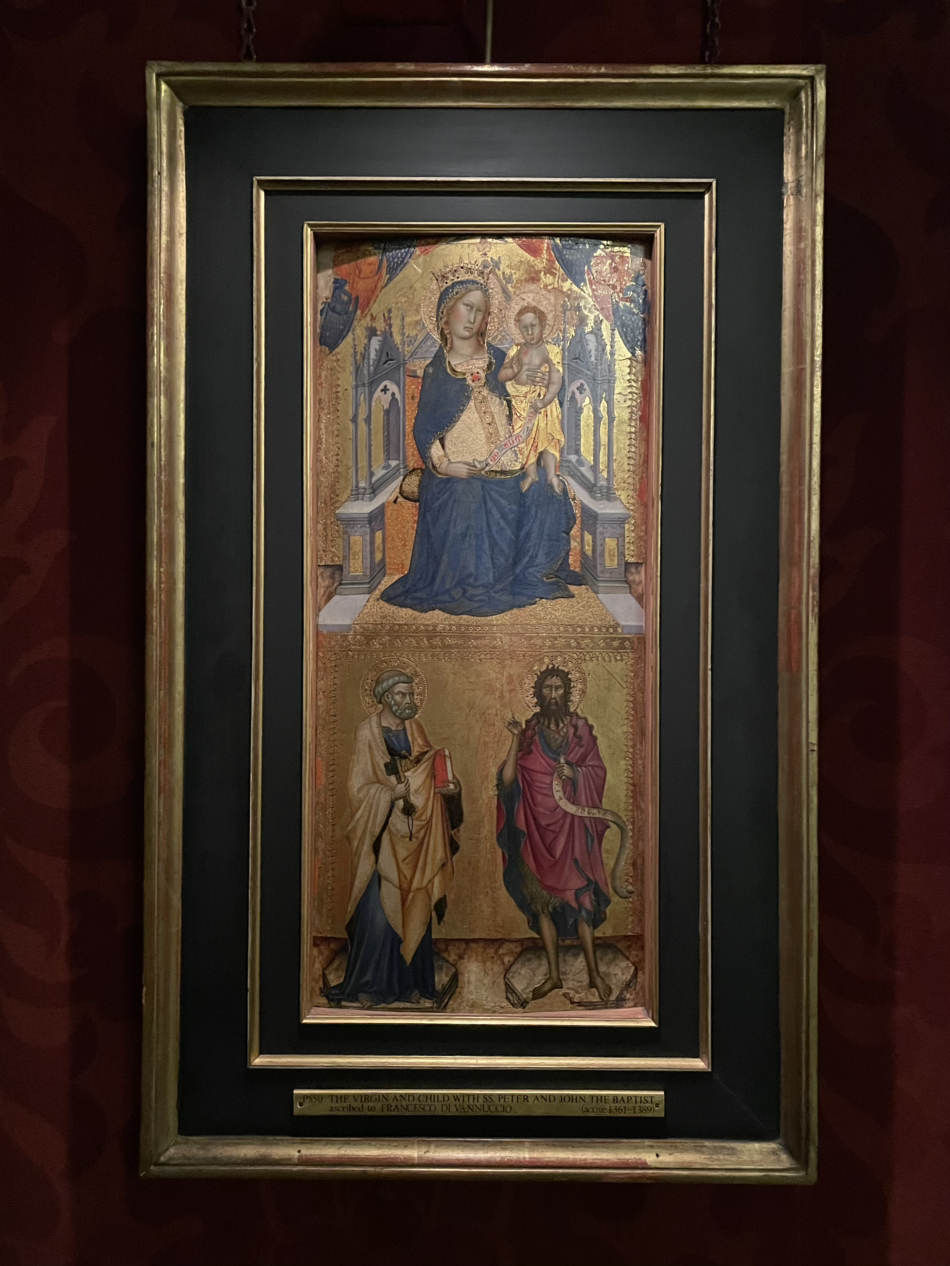 Francesco di Vannuccio(프란체스코 디 반누치오)에게 귀속되었다고 표기되어 있는, 14세기 이탈리아 시에나 지역의 대표적인 종교화 양식의 성화 <성모와 아기 예수, 성 베드로와 세례자 요한>. 전형적인 금박 배경과 세밀한 묘사가 돋보이는 작품으로 왠지 눈길이 가는 매력을 지녔다.