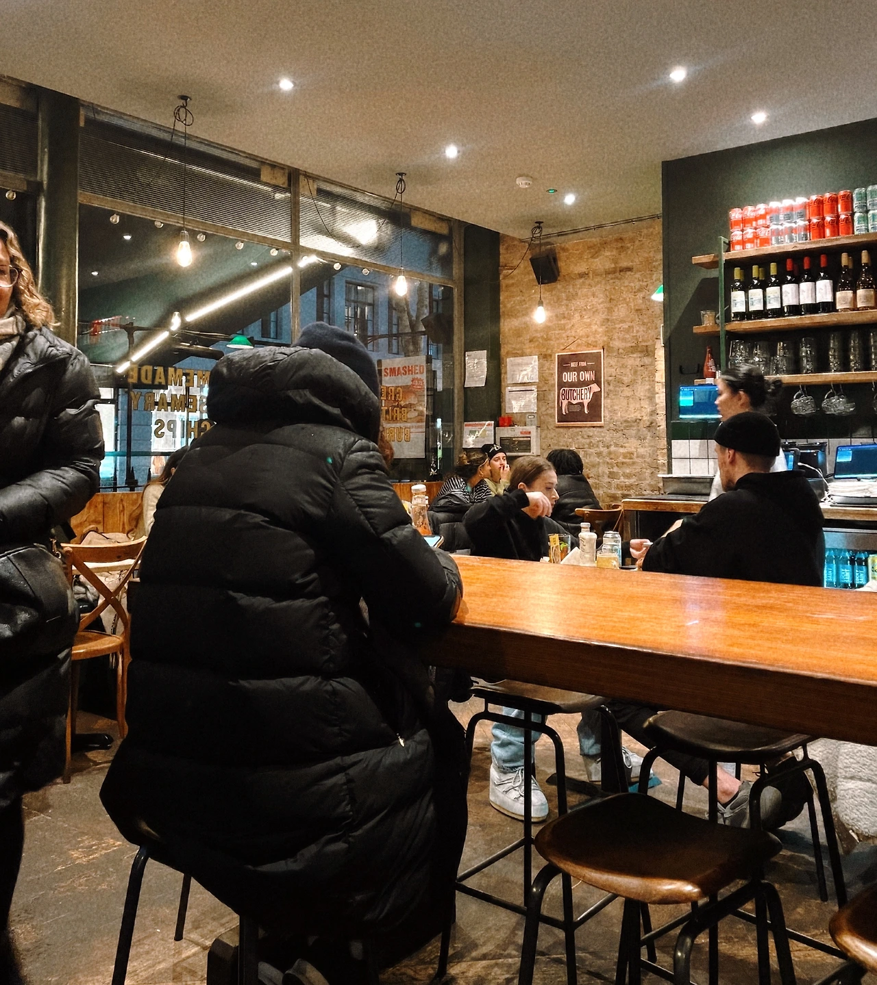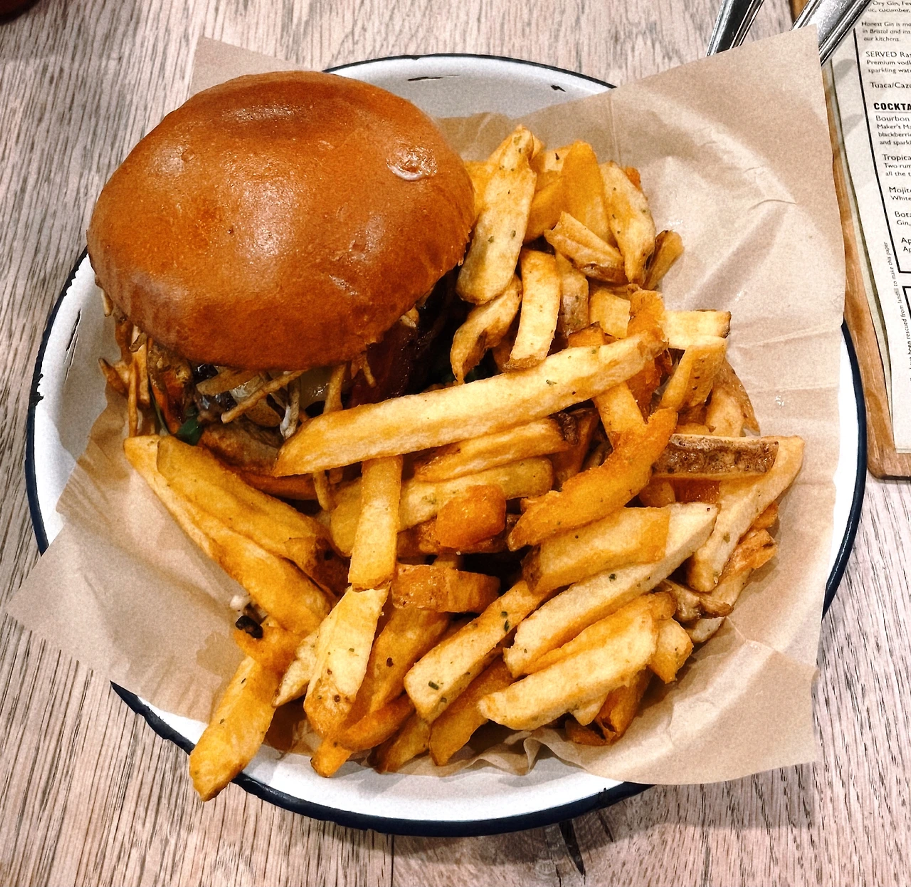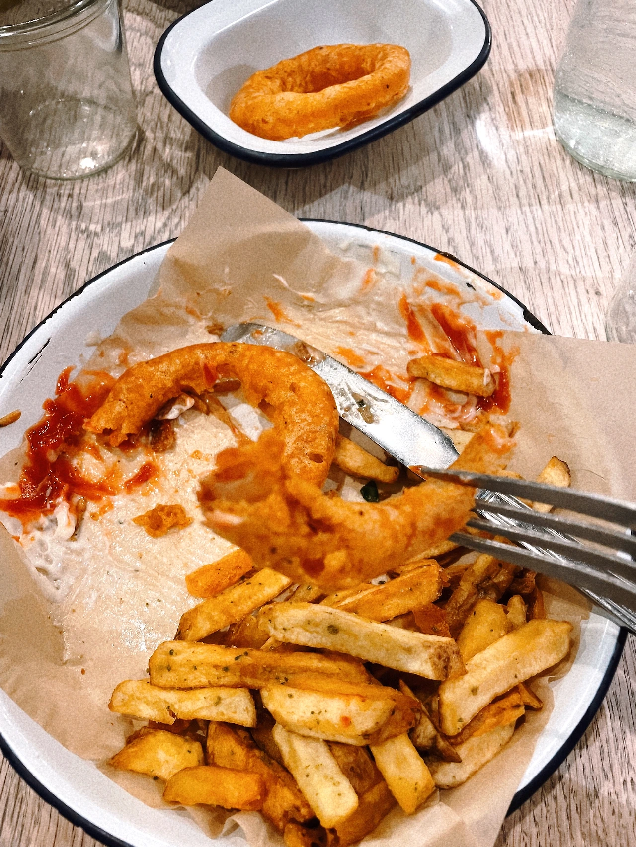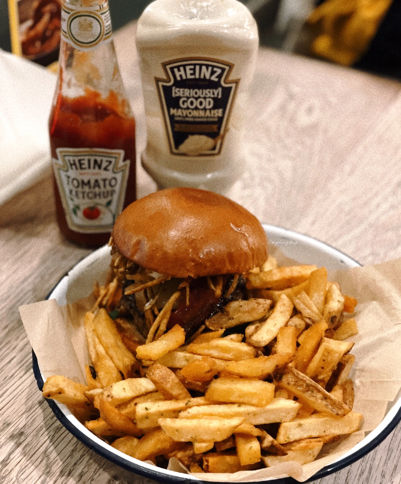 내 버거를 주문하고 얼마 지나지 않아 다행히 친구가 도착했다. 어쨌든 내 음식이 그녀의 음식보다 먼저 나왔고, 민망하지만 나 홀로 먼저 식사를 시작했다. 감자 요리로는 실망할 일 없는 런던답게 감자튀김이 맛있다. 저 많은 양의 감자를 하인즈 마요네즈와 케첩에 찍어 몽땅 먹어 치웠다.