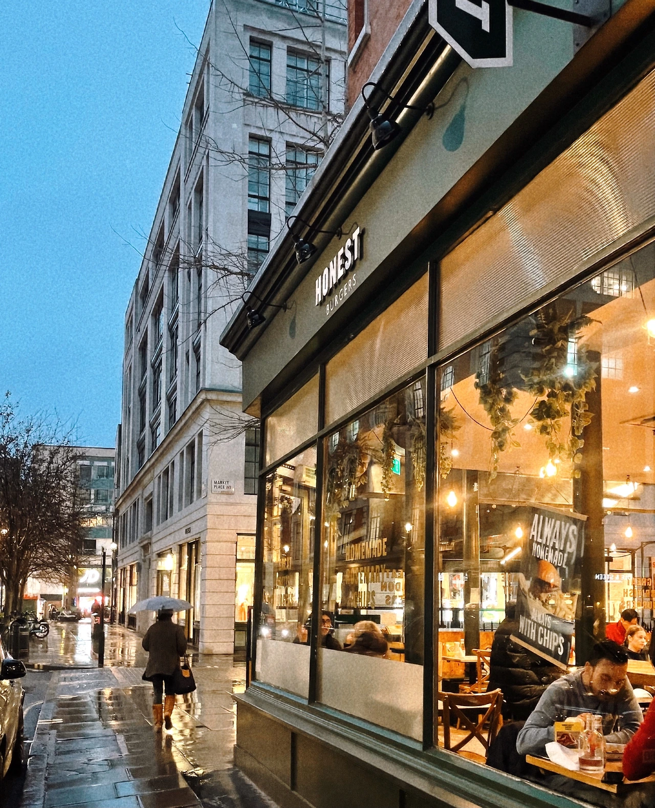 드디어 사막 속 오아시스처럼, 오늘의 저녁 장소, Honest Burger(어니스트버거)가 나타났다. 사실 친구와 약속한 시간은 꽤 많이 남았지만 Wallace Collection이 일찍 문을 닫았고, 우산도 없는 형편에 비는 내리고, 주머니 사정은 넉넉지 못하여 그냥 식당으로 와 버렸다. 내 친구가 잠시 후에 여기로 합류할 건데 그때까지 여기서 기다려도 되냐고 직원에게 물어보니 흔쾌히 허락하며 자리로 안내해 주었다.