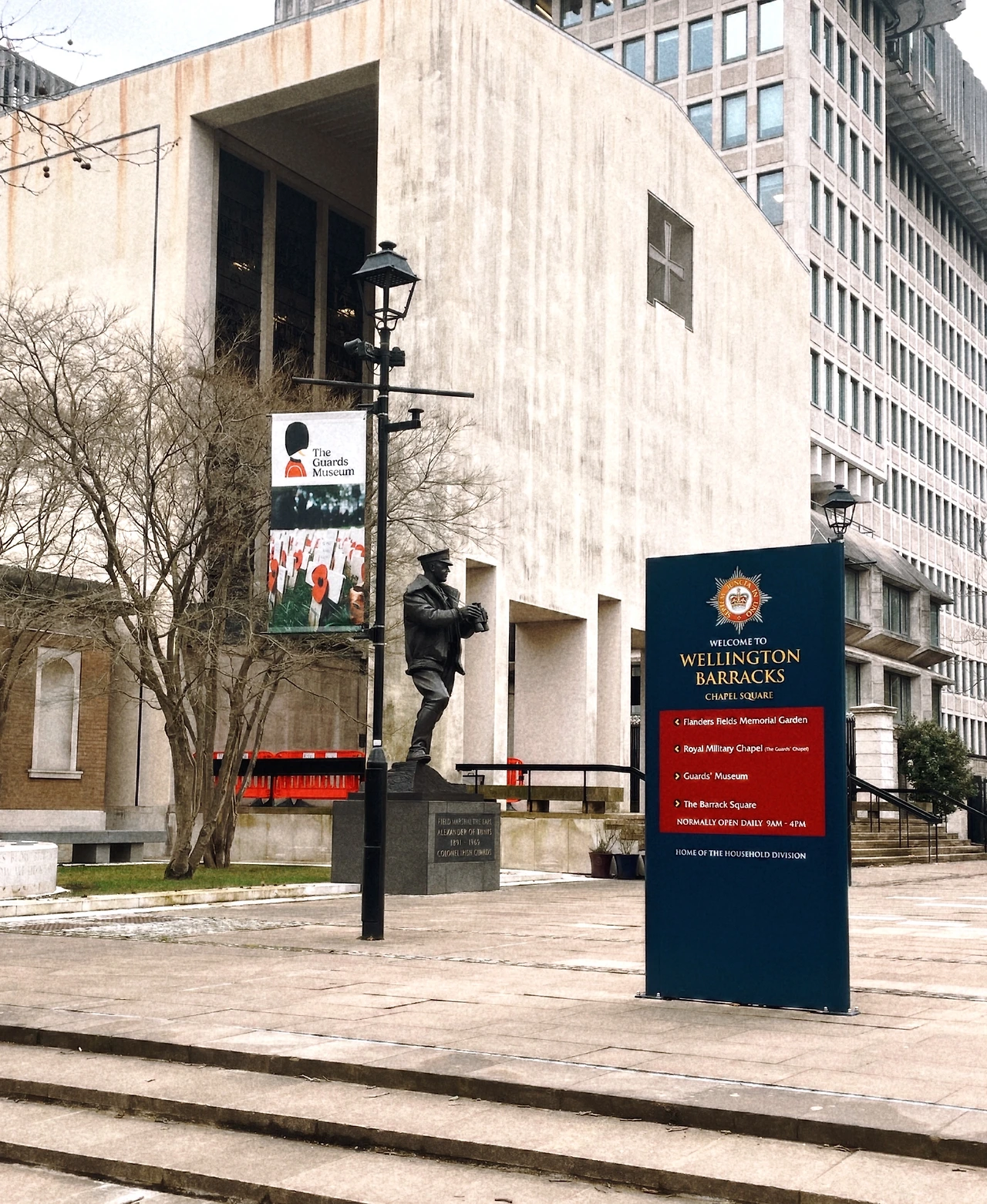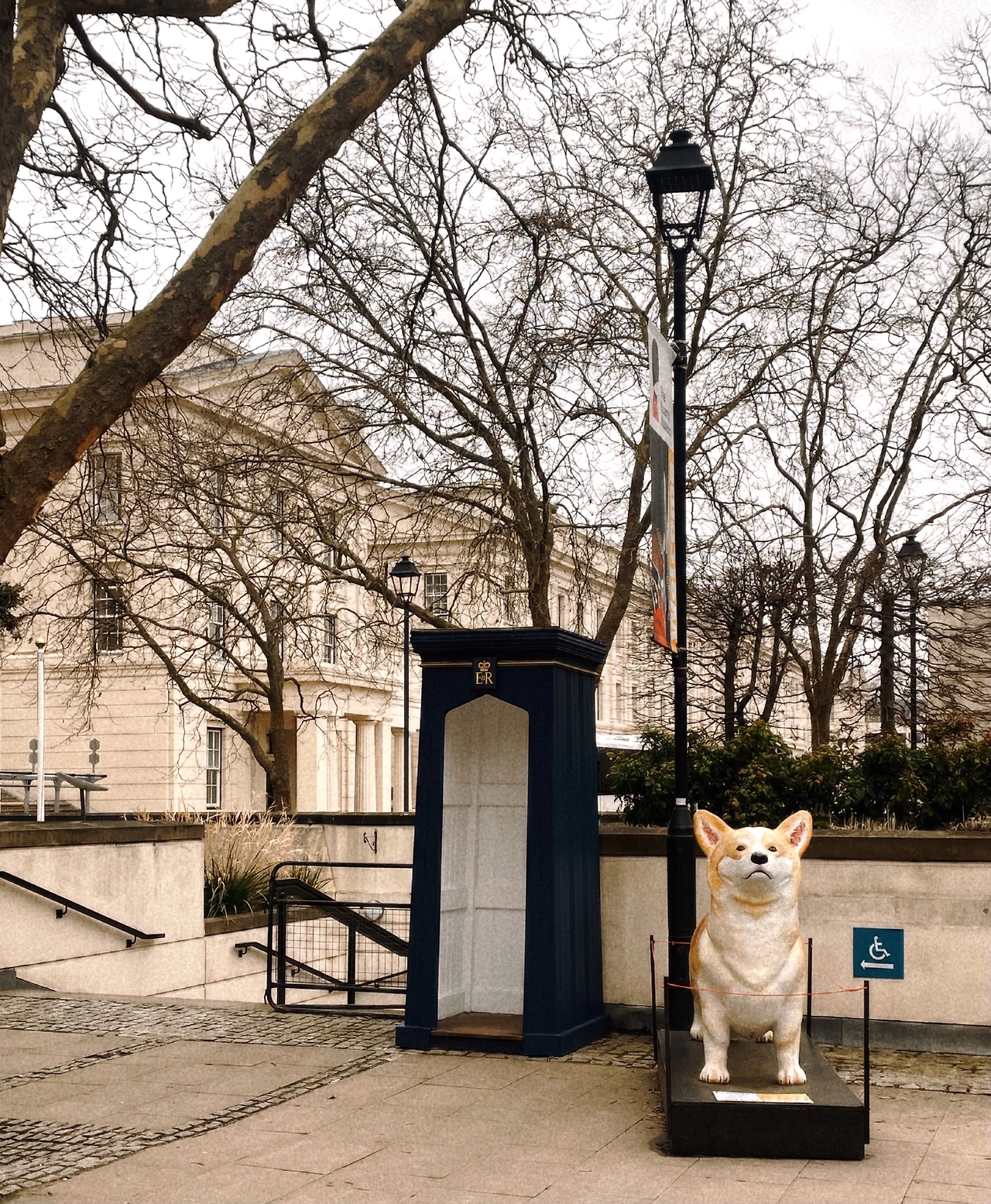 지나가다가 The Guards Museum(근위대 박물관) 팻말을 보고는 호기심이 생겨서 안뜰로 들어와 봤다. 무료 관람이면 입장하려고 했는데 유료여서 도로 나왔다. 바로 맞은편에는 Wellington Barracks라는 근위대 본부 격의 건물이 있었고, 박물관으로 가는 입구 옆에는 귀여운 웰시코기 동상이 놓여 있었다. 영국 왕실에서 사랑받는 견종이자 The Welsh Guards의 마스코트여서 놓여있는 모양이다. 아무래도 사람들은 귀여운 걸 좋아하니까 말이다.