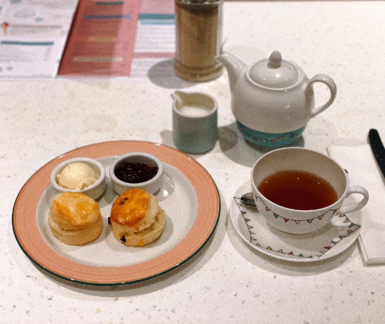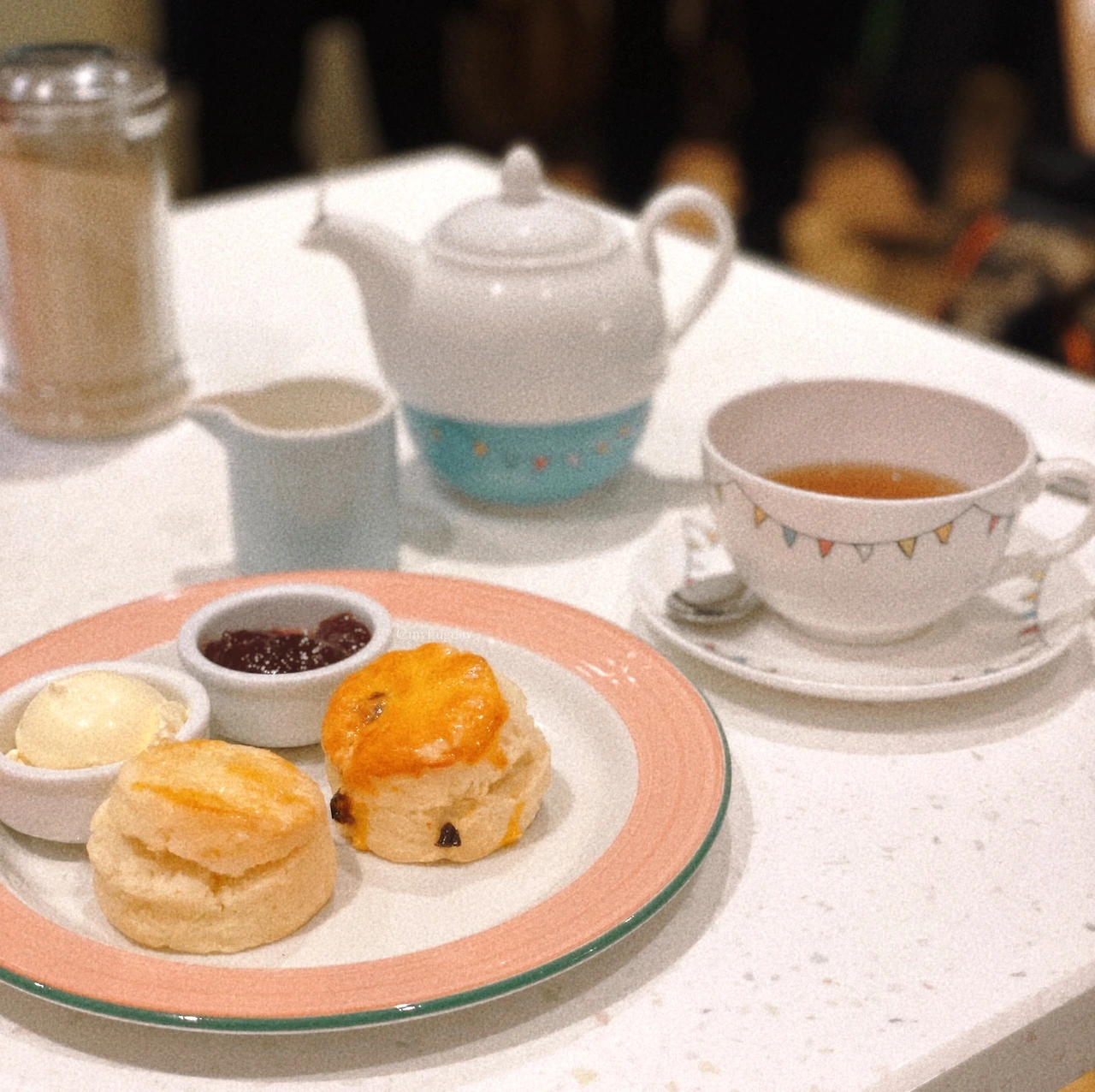 스콘을 주문하니 플레인 스콘과 프루트 스콘 각각 한 덩이씩 총 두 덩이가 제공된다. 클로티드크림과 과일잼도 빠지지 않고 함께 나온다. 크림과 쨈은 아마도 포트넘 앤 메이슨의 자사 제품일 것으로 추정되는데 정말 맛있었다. 이 클로티드크림을 G층에서 판매하지 않을까 싶어 나가는 길에 열심히 살펴봤는데 아무리 샅샅이 뒤져 보아도 판매용 클로티드크림은 없었다. 쨈과 버터, 심지어 치즈도 있는데 클로티드크림만 없더라.