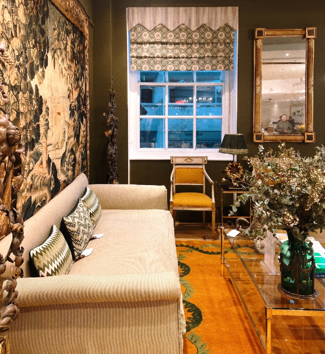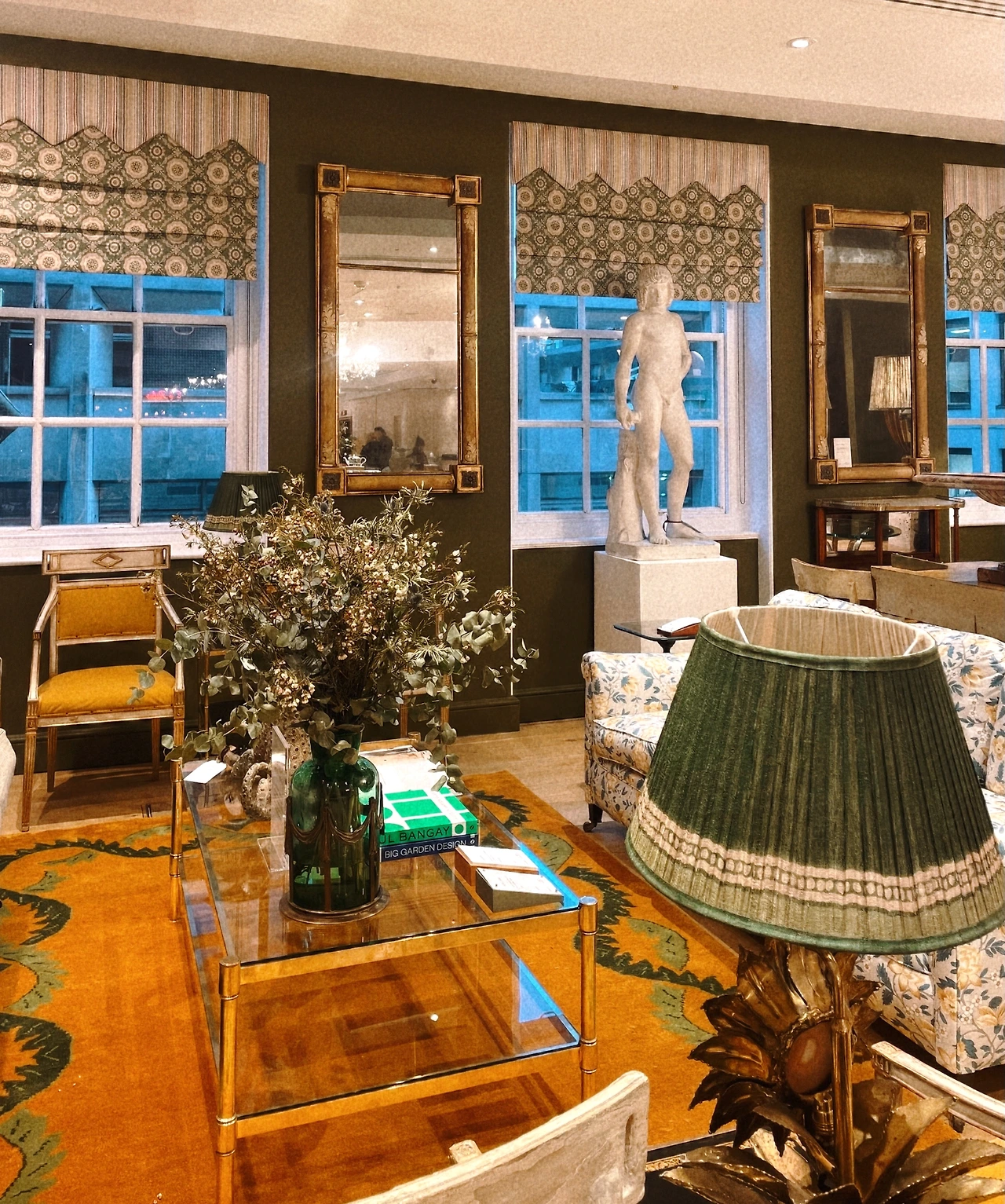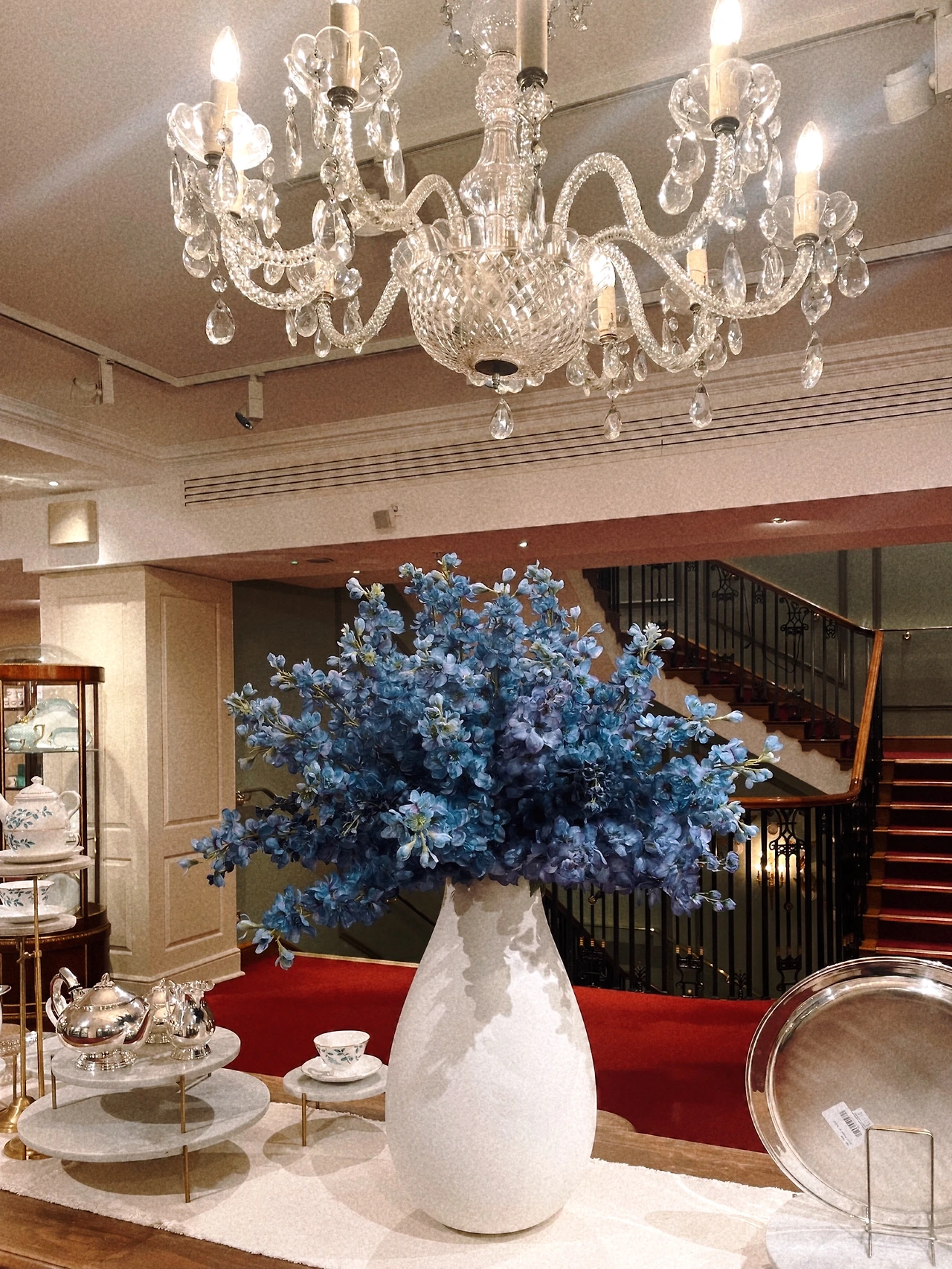 천장에 달아 놓은 샹들리에도 예쁘고, 그 아래 놓인 흰 화병과 푸른색 꽃도 어쩜 참으로 예쁘다. 포트넘 앤 메이슨은 흰색과 푸른색의 대비를 참 좋아하는 것 같다.