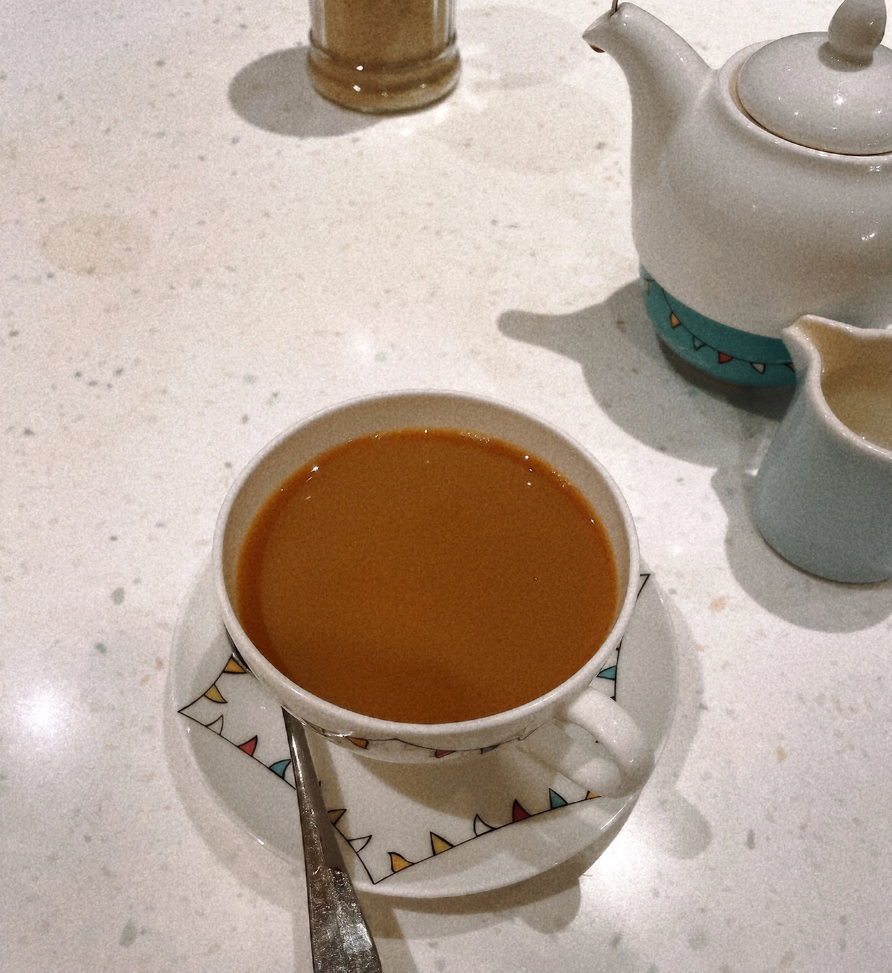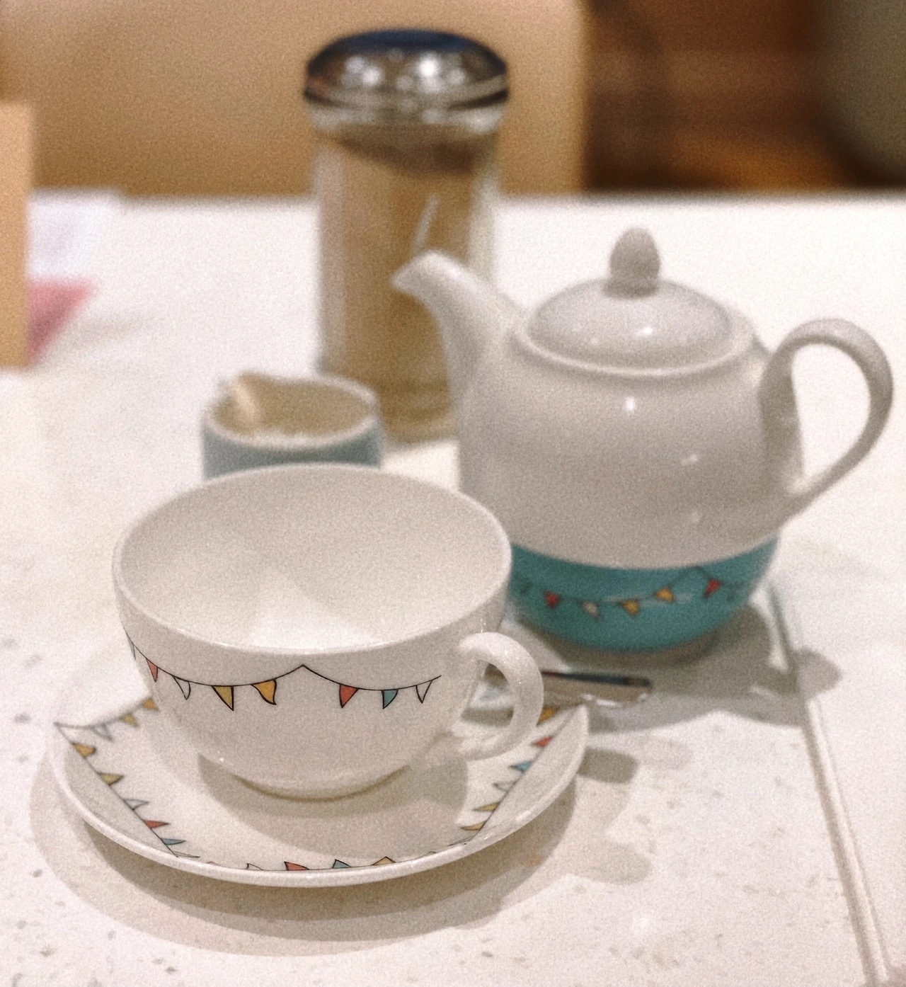 차가 담긴 포트넘 앤 메이슨의 찻주전자와 찻잔도 정말 앙증맞고 귀엽다. 하얀색과 청록색 배합에 알록달록 작은 깃발 무늬가 있는 다구라니!