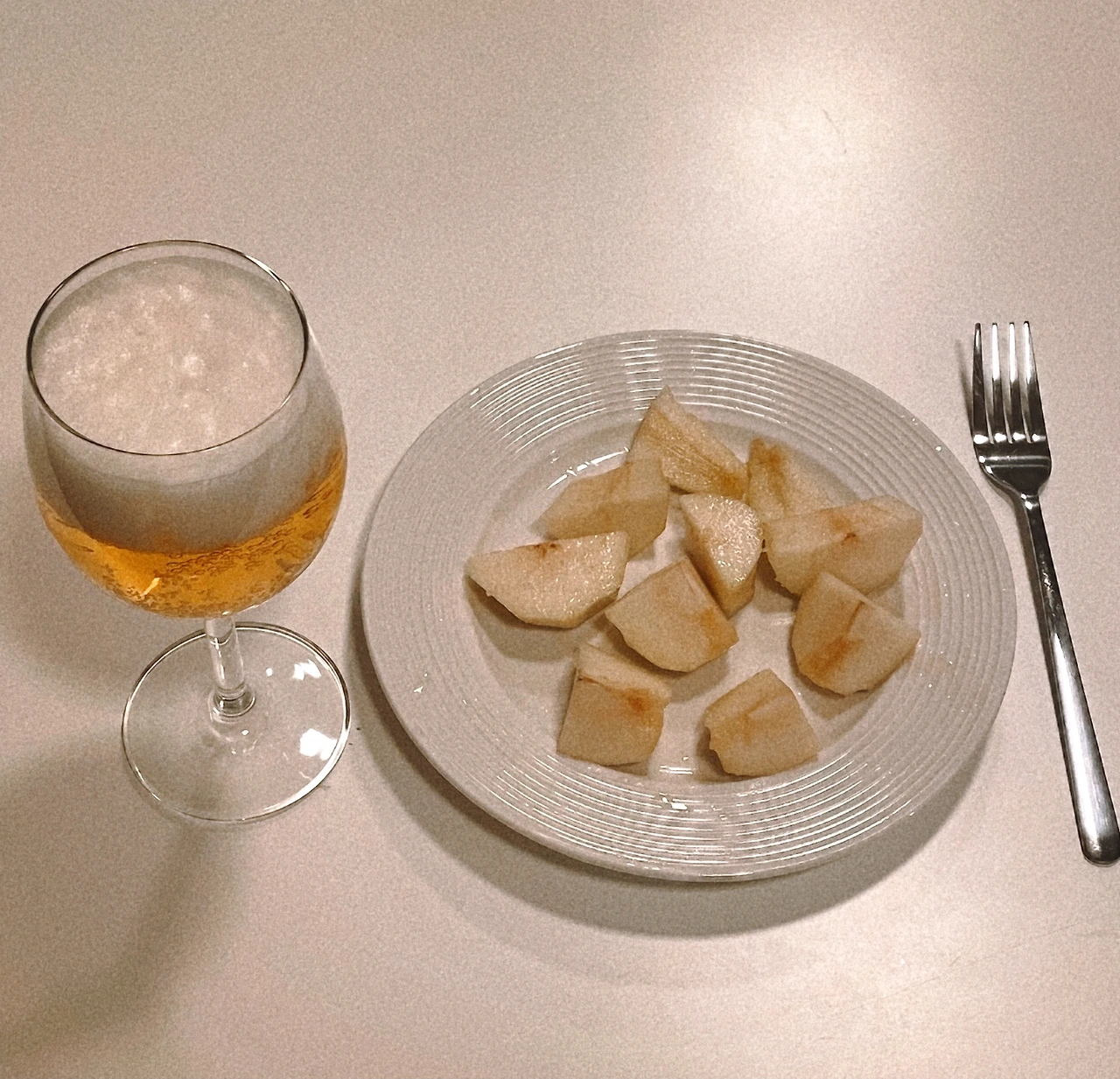 남은 서양배 한 개를 해치우면서 맥주도 한 잔 곁들였다. 하지만 맥주가 맛없어도 너무 맛없어서 결국 저 한 잔도 채 다 마시지 못하고 배수구에 부어 버렸다. 이 서양배엔 드라이한 화이트와인이 잘 어울렸을 것 같다.
