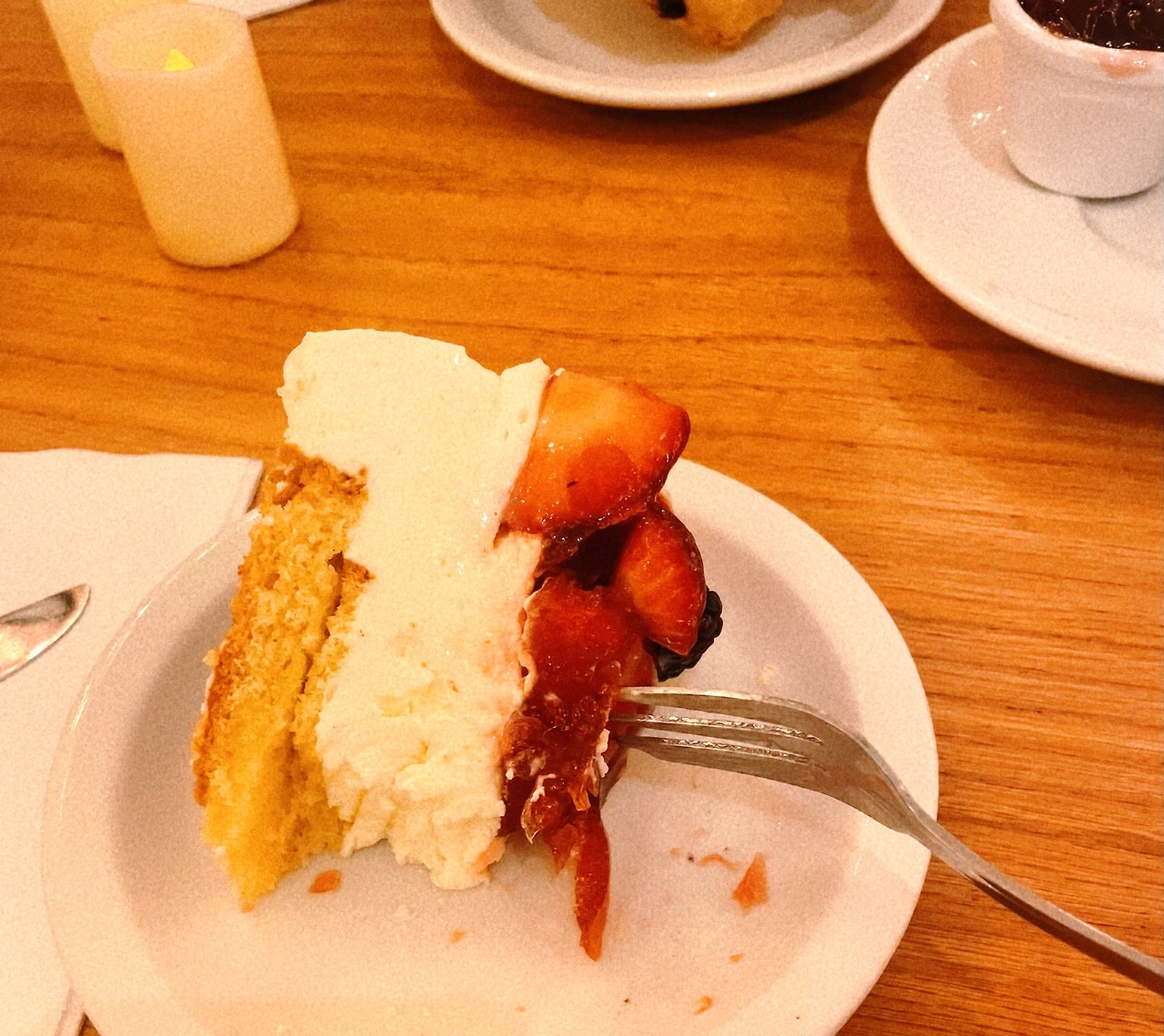 한국인들에게는 메종베르토가 스콘 맛집으로 유명하지만 사실 메종베르토는 케이크로 유명한 카페라고 하여 이번엔 케이크를 주문해 봤다. 엄청나게 맛있어서 눈물 날 정도는 아니지만 맛있었다. 케이크 위에 올라간 베리 콤포트에 젤라틴이 섞여 있어 젤리와 같은 식감이었는데 그 점이 다소 내 취향에 맞지 않았다.