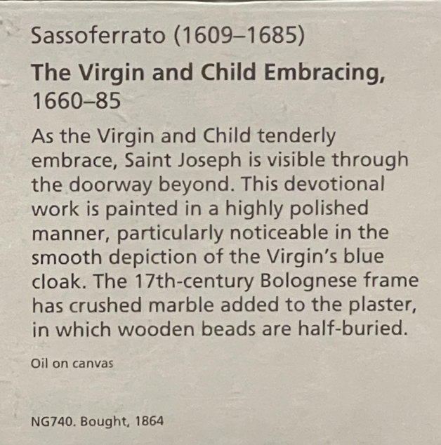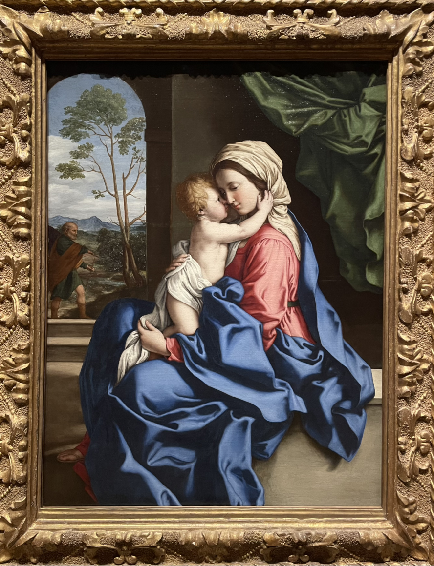 성모가 입은 옷의 질감과 모자의 다정하고 따스한 분위기가 눈에 띄는 이 그림은 Sassoferrato(사쏘페르라토)에 의해 그려졌다.