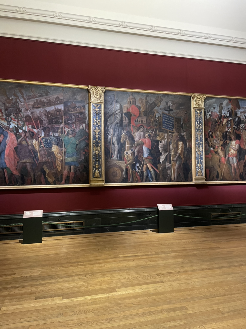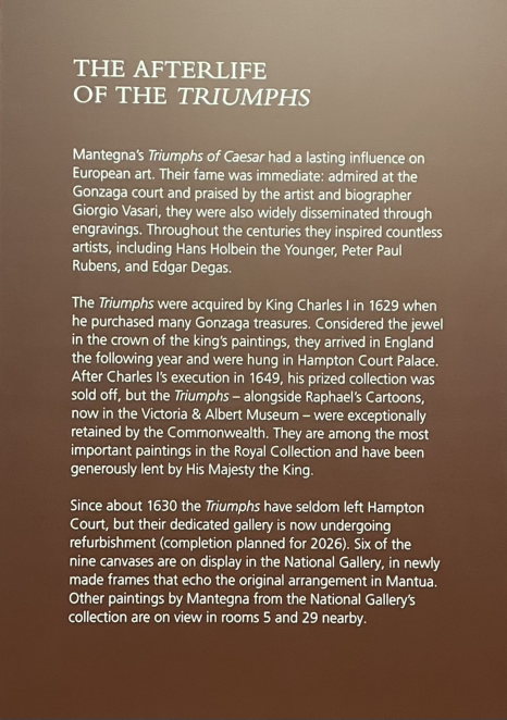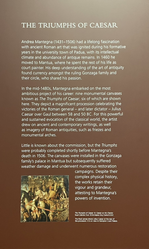 Andrea Mantegna(만테냐)는 고대 로마 예술에 깊이 매료되어 있었던 르네상스 시기 화가로, 고전 문헌 및 로마 유물 등을 연구하여 이를 바탕으로 아홉 점의 대형 작품들을 제작했다고 한다. 내셔널갤러리에 전시된 이 연작은 율리우스 카이사르의 승리를 기념하는 개선 행렬을 주제로 한 것이며, 당시 만테냐는 Mantua의 궁정화가로 일하며 이 시리즈를 완성하였고, 처음에는 Mantua의 Gonzaga 가문 소장품이었다가 현재는 찰스 3세의 소장품이자 영국 왕실 소장품으로 아주 귀중한 대우를 받으며 보존되어오고 있다고 한다. 1629년 찰스 1세가 이 연작을 매입한 후, 1630년경 이래로 쭉 Hampton Court에 전시되어 왔으나 현재 그 전시공간은 2026년까지 보수작업이 진행될 예정이라 임시로 내셔널 갤러리에서 6점을 전시하게 되었단다.