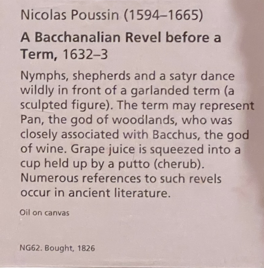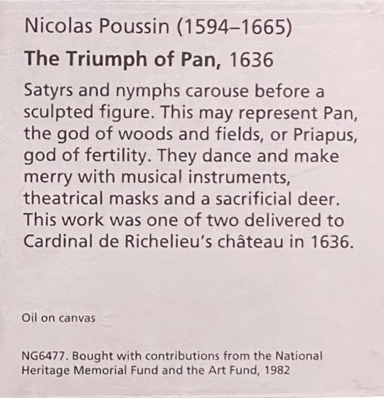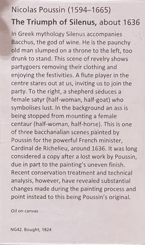 <판의 승리>와 같이 인간 쾌락의 절정을 신화 속 한 장면에 은유하여 그려낸 또 다른 작품 <실레누스의 승리>이다. 설명에 따르면 이 작품은 리슐리외 추기경을 위해 푸생이 제작한 바쿠스 연작 중 하나이며, 한때는 진품이 아닌 모작으로 여겨져 왔던 바 있으나 보존 및 분석 결과 현재는 푸생의 진품으로 인정받고 있다고 한다.