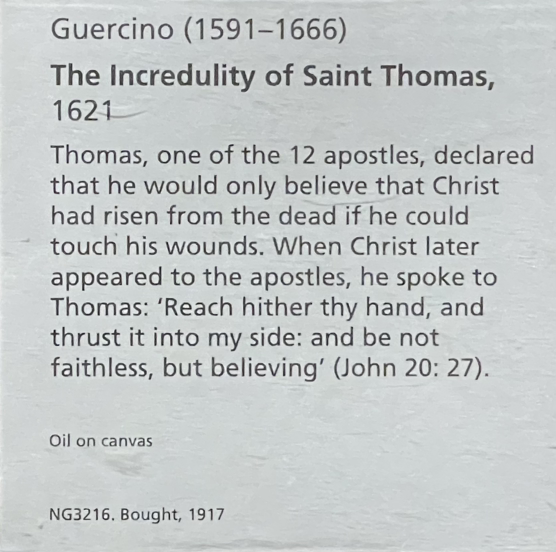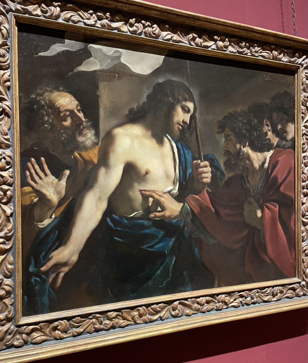 다음은 Guercino(귀레치노)의 <성 토마스의 의심>이다. 앞선 카라바조 또한 일찍이 동일한 장면을 소재로 하여 동일한 제목의 작품을 그린 바 있다. 극적인 긴장감이 감도는 극사실주의의 카라바조의 그림과 달리, 귀레치노의 그림은 좀 더 부드럽고 온화하다.