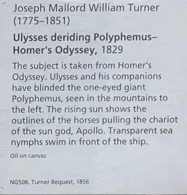내셔널 갤러리에 와서 터너 작품을 보지 않고 갈 수는 없는 법. 이 작품은 J. M. W. 터너의 걸작들 중 하나로 손꼽히는 <폴리페모스를 조롱하는 율리시스 - 호메로스의 오디세이로부터>이다.
