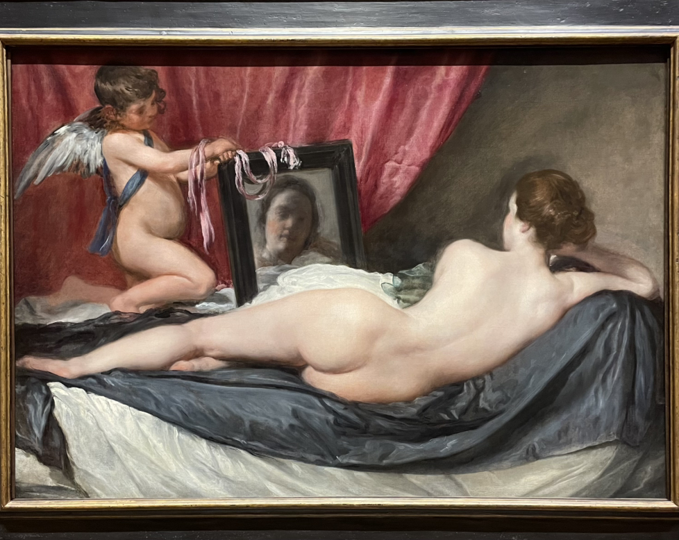 우리에게는 거울 속 비너스의 시선으로 유명한 작품, 벨라스케스의 <로크비의 비너스>이다. 거울 속에 비친 비너스의 시선이 마치 비너스 등 뒤에 선 관람자를 향하고 있는 것처럼 보여 감상자를 당황하게 만드는 흥미로운 그림이다. 설명문에 의하면 당시 스페인에서는 엄격한 종교 검열로 인하여 여성 누드화가 그려지는 일이 매우 드물었다고 하니 이 작품은 단순한 누드화를 넘어 그 자체만으로도 대담하고 도전적인 시도였음을 짐작할 수 있다.