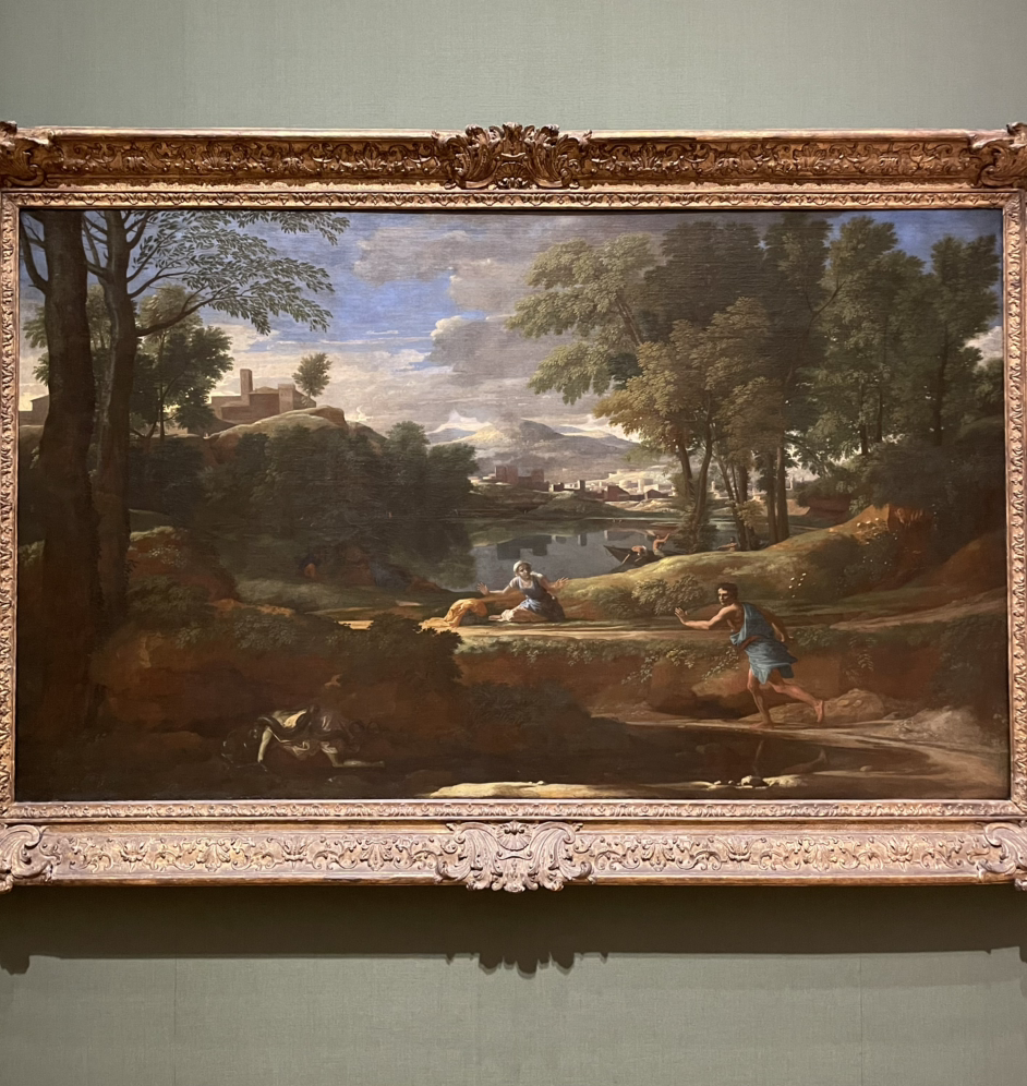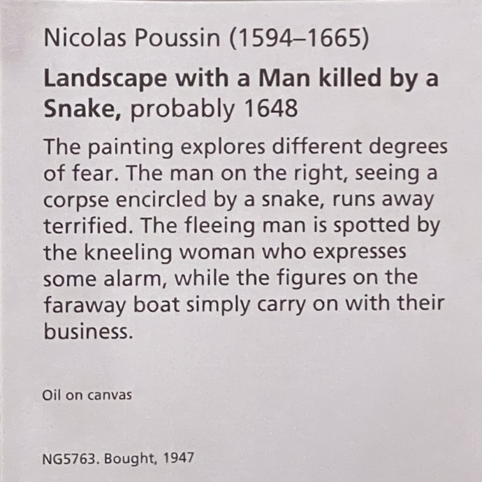 아래 작품은 프랑스 바로크 시기를 대표하는 화가 Nicolas Poussin(니콜라 푸생)의 작품이다. Landscape(풍경)이라는 제목을 달고 있지만 이 작품은 인간의 공포 반응을 세 단계로 나누어 표현하고 있는 철학적인 작품이다. 뱀에 의해 죽은 왼쪽의 남성에 대한 반응으로 각각 오른쪽의 남성은 '극도의 공포'를, 중앙의 여성은 '놀람 및 불안'을, 먼 뒤편의 사람들은 '무관심'을 드러내고 있다. 이 세 가지 반응이 마치 목가적인 것처럼 보이는 풍경 속에 녹아들어 이 작품의 아이러니한 매력을 만들어내고 있다.