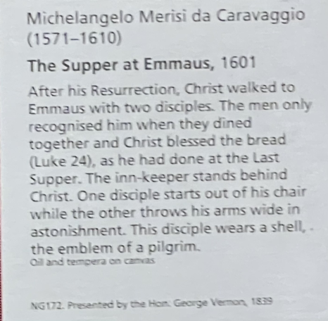 카라바조의 또 다른 작품 <엠마오의 만찬>이다. 종교적으로 중요한 순간을 사실적이고도 극적인 묘사를 통해 카라바조만의 방식으로 캔버스 위에 구현했다.