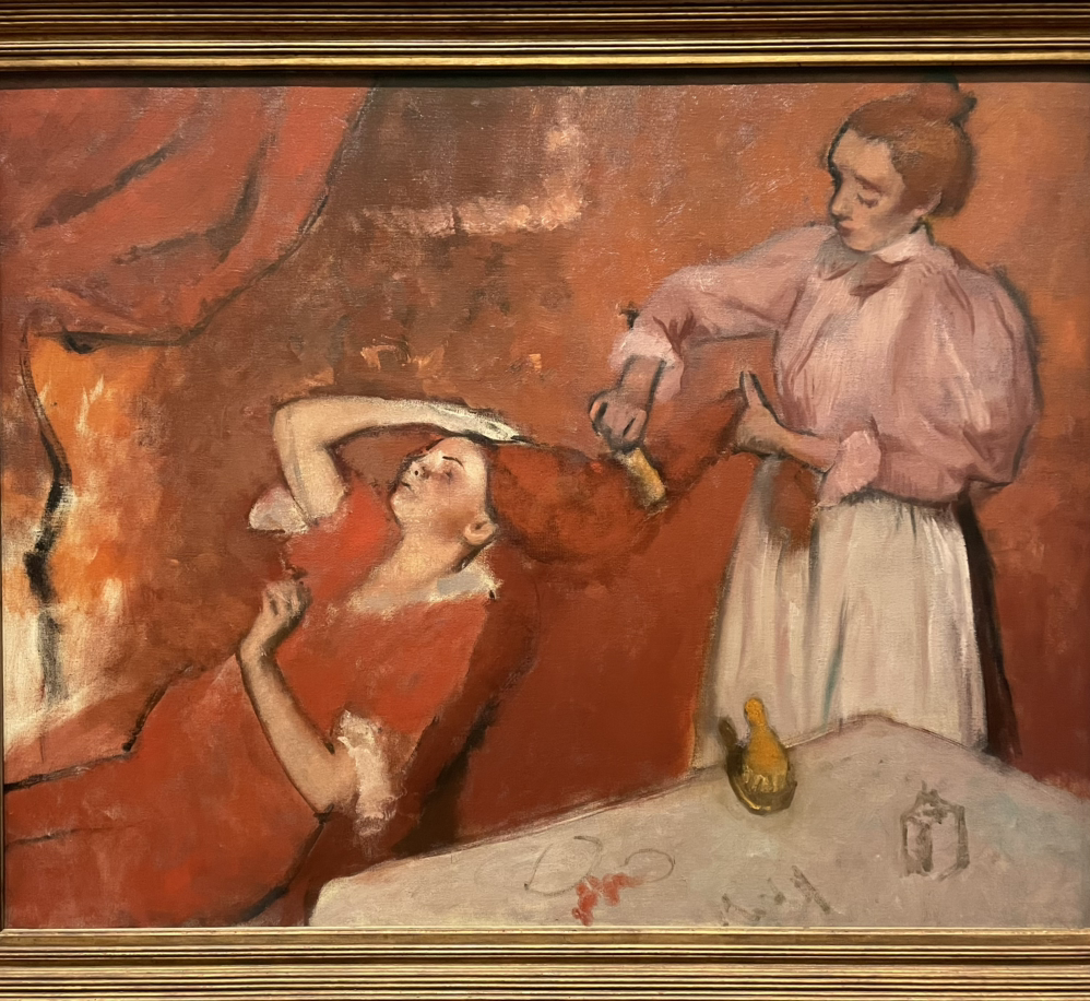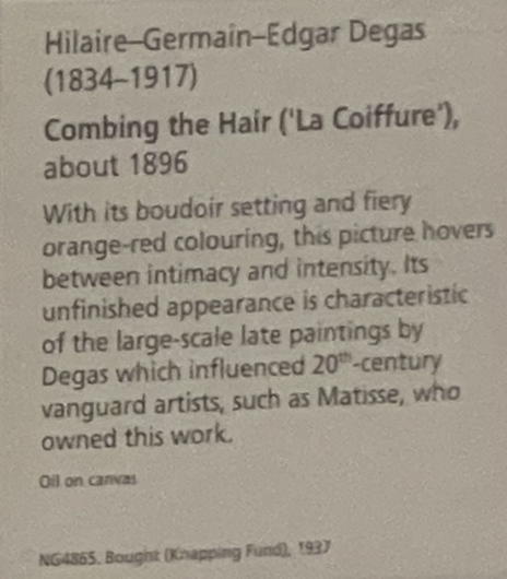 수많은 작품들을 둘러보고 나가기 직전 들른 마지막 방에서 전에 못 보던 작품을 발견했다. Edgar Degas(에드가 드가)의 <머리를 빗겨주는 모습>이다. 온통 붉은색으로 칠해져 있어 못 보고 지나쳤을 리가 없을 텐데, 새로 가져다 놓은 작품인가? 아무튼 이 특유의 붉은 색채가 매우 인상적이다. 드가의 여느 작품들과는 제법 다른 느낌도 나고 말이다. 설명문에 의하면 말년의 드가의 후기 화풍은 20세기 아방가르드 예술가들에게 영감을 주었고, 특히 이 작품의 경우 Matisse(앙리 마티스)에게 지대한 영향을 주었을 뿐만 아니라 마티스는 이 작품을 소장하기까지 했다고 한다.