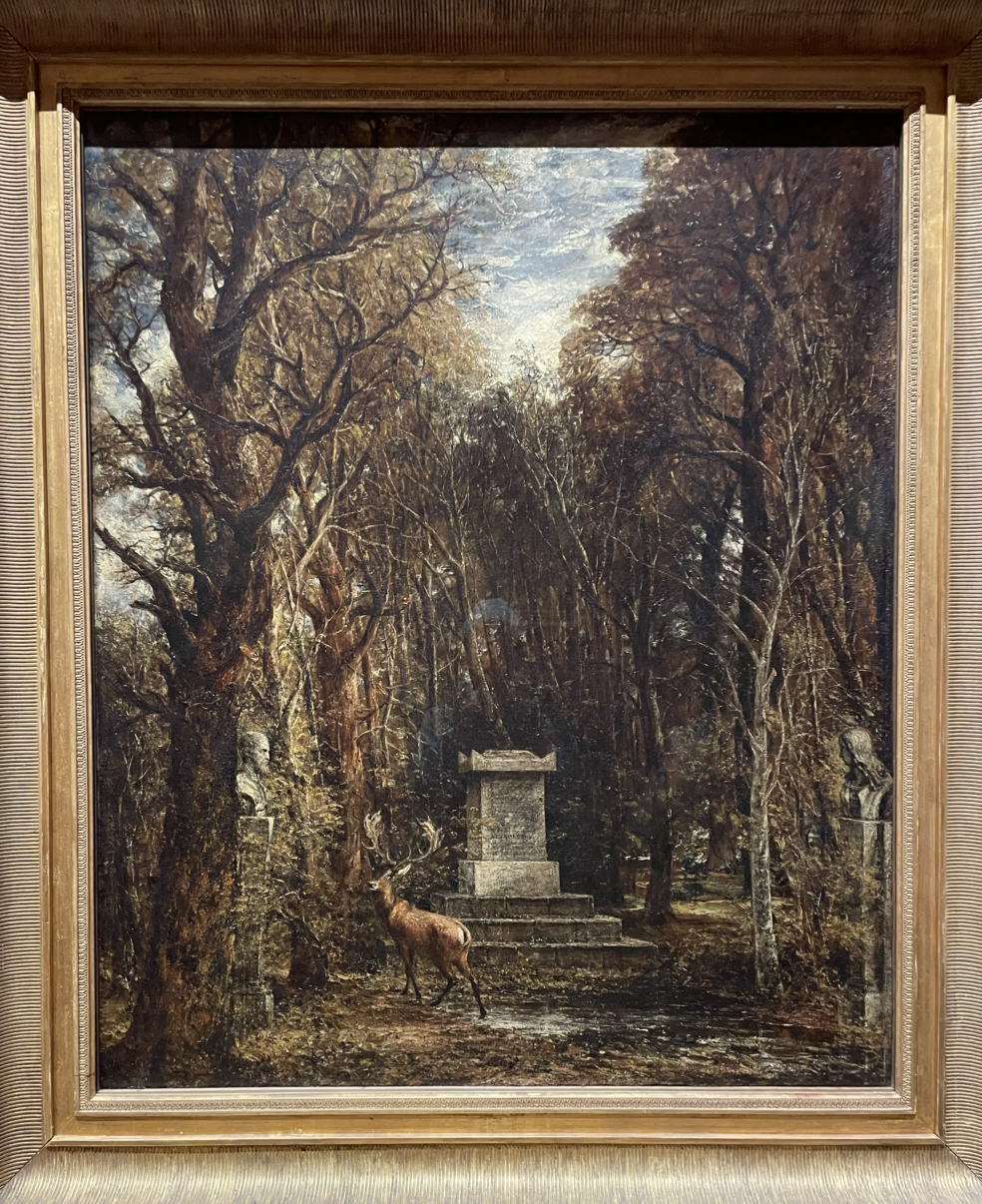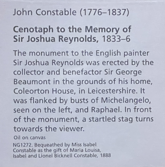 Turner(터너)의 작품을 보았다면 John Constable(존 컨스터블)의 작품 또한 빼놓을 수 없는 일이다. 이 작품은 컨스터블의 후기 작품으로, 작품의 제목에서 알 수 있듯 조슈아 레이놀즈 경에 대한 그의 헌사와도 같은 그림이다. Joshua Reynolds(조슈아 레이놀즈)는 영국 왕립 미술원의 초대원장으로, 영국 회화 역사에 공헌한 인물이고, 컨스터블은 레이놀즈를 깊이 존경했다고 한다. 컨스터블은 그림 속 기념비를 통해 죽음은 있을지언정 그가 남긴 예술은 영원함을 말하고자 하였고, 기념비 옆으로 미켈란젤로와 라파엘로의 흉상을 두어 레이놀즈를 이 두 거장에 견줄 만큼 훌륭한 사람으로 묘사하였으며, 전경에 사슴을 배치함으로써 자연의 순수함과 예술이 지닌 생명력을 표현하고자 한 것으로 해석해 볼 수 있다.