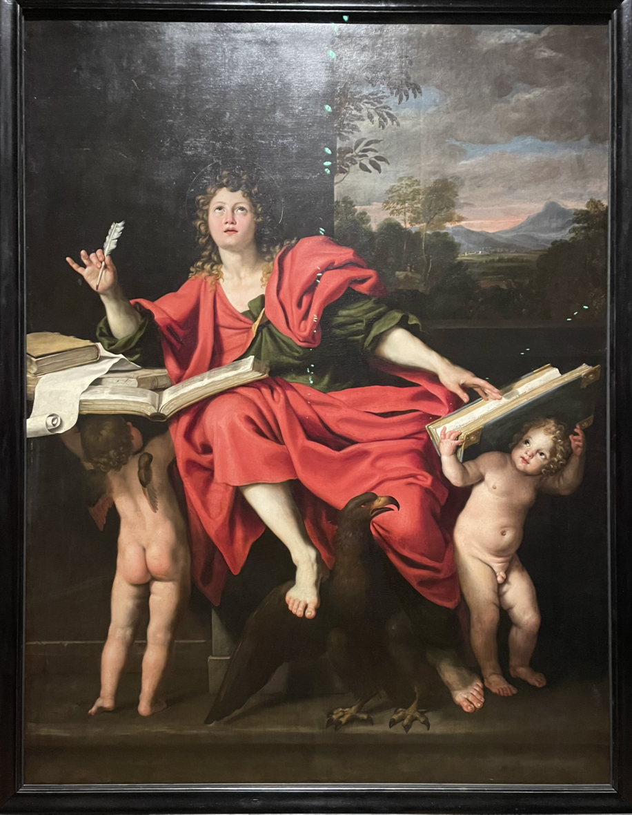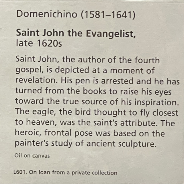 신적, 영적 순간을 묘사한 Domenichino(도메니키노)의 이 작품은 요한복음의 저자 성 요한이 신의 계시를 받는 장면을 그리고 있다. 설명문에 따르면 독수리는 성 요한을 상징하는 동물로, 당시 사람들은 독수리가 하늘과 가장 가까이 나는 새라고 생각했고, 이러한 독수리를 하늘에서 계시를 받는 성 요한에 비유했다고 한다. 또한, 그림 속 성 요한의 인체 비율이나 자세로 미루어 보아 도메니키노는 고대 그리스 로마 예술에서 인체의 이상적인 비례 및 자세를 학습하였을 것으로 추정된다고 한다.