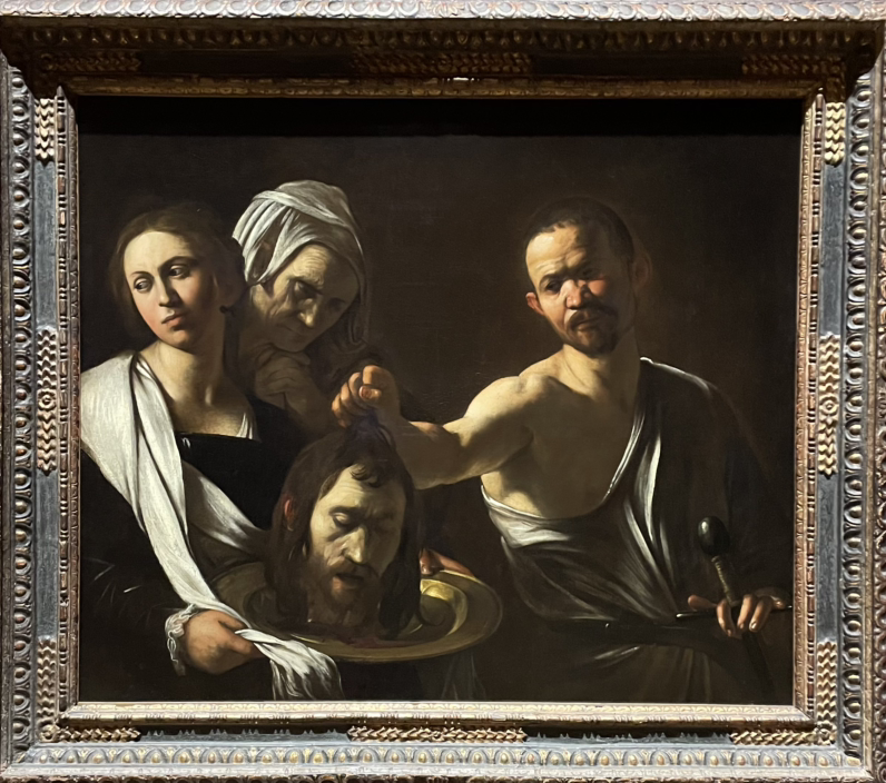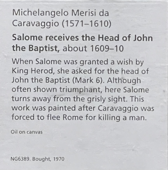 또 다른 카라바조의 그림 <세례 요한의 머리를 들고 있는 살로메>는 종교 장면의 한 순간을 그리고 있지만 사실 카라바조의 개인사와 내면세계를 그려낸 작품이라고 해설되고 있다. 이 그림은 카라바조가 로마에서 살인을 저지르고 난 후 나폴리에서 도피 생활을 하는 동안 그려졌으며, 이는 그의 죄책감과 불안이 극에 달하던 말년의 시기에 해당한다. 작품의 색조, 명과 암의 대비, 인물들의 표정을 통해 그가 작품으로 속이야기를 털어놓고 있음을 느낄 수 있다.