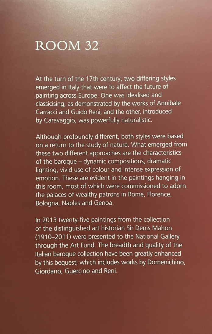 이어지는 32번 방에 얼마나 훌륭한 작품이 있는가에 대하여 구구절절 써 놓았다. 17세기 초, 안니발레 카라치와 귀도 레니를 주축으로 한 고전주의적 양식과 카라바조를 주축으로 한 강렬한 자연주의적 양식이 이탈리아에서 크게 성행했음을 설명하고 있다.