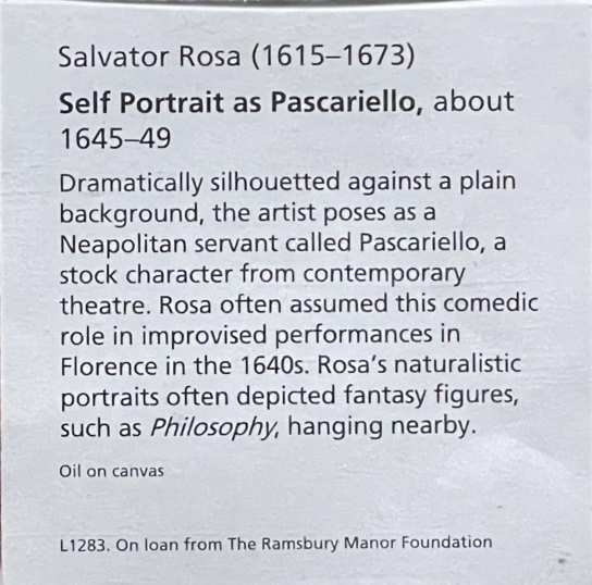 마녀들의 기괴한 판타지를 그렸던 로사는 또한 편 <파스카리엘로로 분장한 자화상>을 그렸다. 이 작품 속에서 로사는 자신을 화가가 아닌 배우로 표현하며 스스로가 지닌 다양한 정체성과 재능을 초상화에 담아냈다.