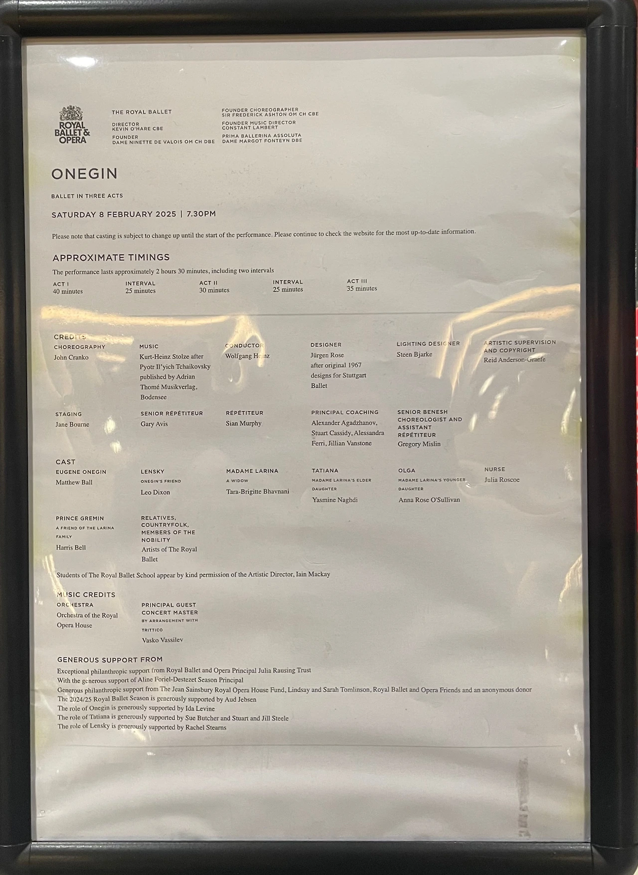 런던에는 깊은 역사와 의의를 지닌 공연장 및 공연단이 많이 있는데 그중 Royal Opera House(로열오페라하우스)와 Royal Ballet(로열발레단)를 빼놓을 수 없을 것이다. 이 날은 바로 그 로열 오페라 하우스에서 로열 발레단의 Onegin(오네긴) 공연을 본 날이다. 런던에서의 첫 발레 관람이자 나의 오네긴 첫 관람이라 무척 설렜다. 오네긴을 비롯하여 백조의 호수, 지젤, 호두까기 인형 등 차이코프스키의 발레 모음곡들을 매우 좋아하지만 돌이켜보니 그중 유난히 오네긴은 그 인기에 비해 한국에서는 별로 상연된 바가 없는 것 같다. 당장 서울 예술의전당의 지난 12년간의 공연 일정만 보아도 오네긴은 고작 4회의 공연에 그친다. 그중에서도 국립발레단이 오네긴을 예술의전당 무대 위에 올린 적은 단 한 번도 없으니 문득 이유가 궁금하다.