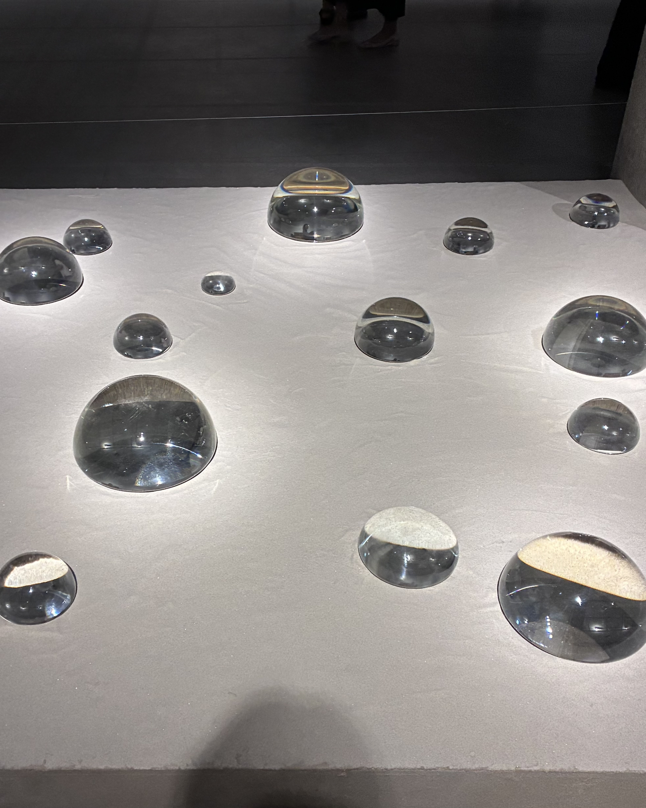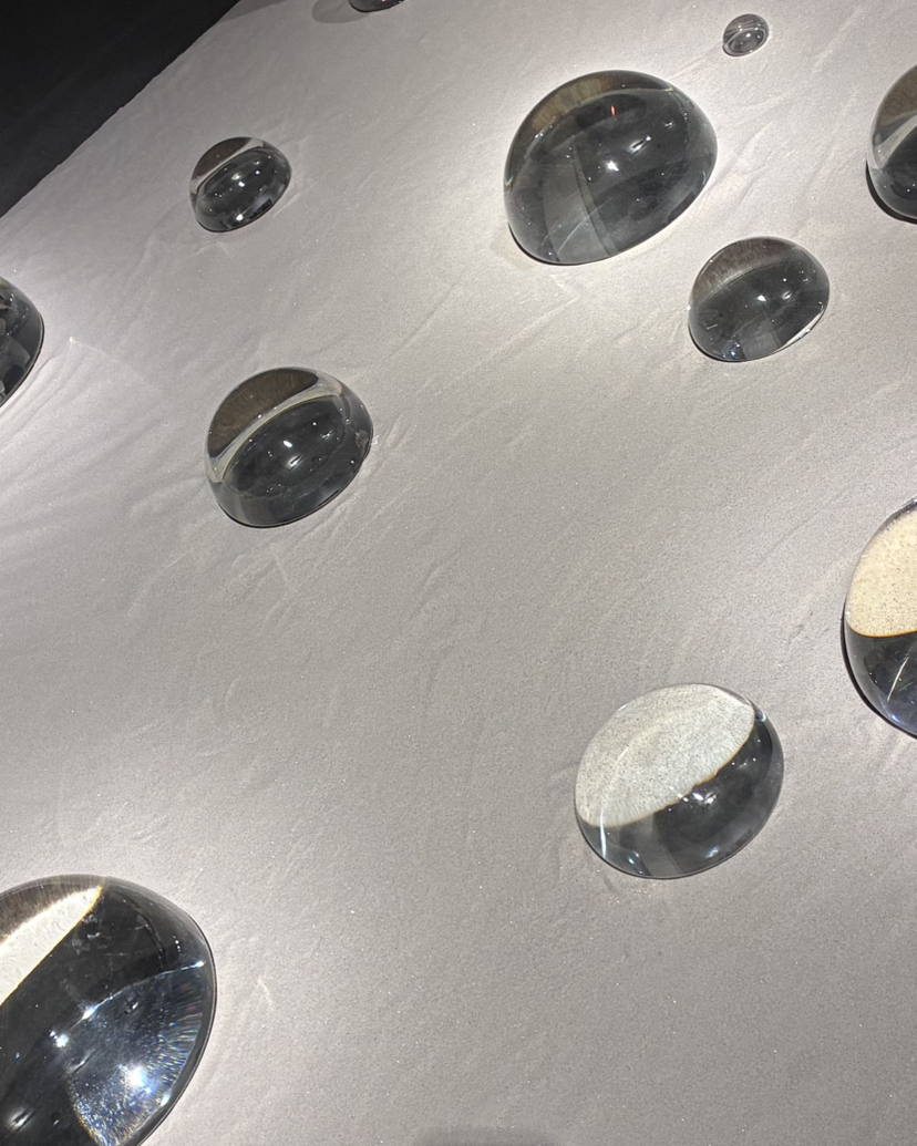 들어서자마자 돌과 유리로 제작된 조형물이 시선을 잡아 끈다. 전시장 조명을 받은 투명한 유리 방울들은 각도에 따라 각양각색의 빛깔을 만들어 내고 있었는데, 까만 밤 달빛 아래 빛나는 조약돌과 같이 보이는 것이 왠지 동화 <헨젤과 그레텔> 속 한 장면을 떠올리도록 하였다.