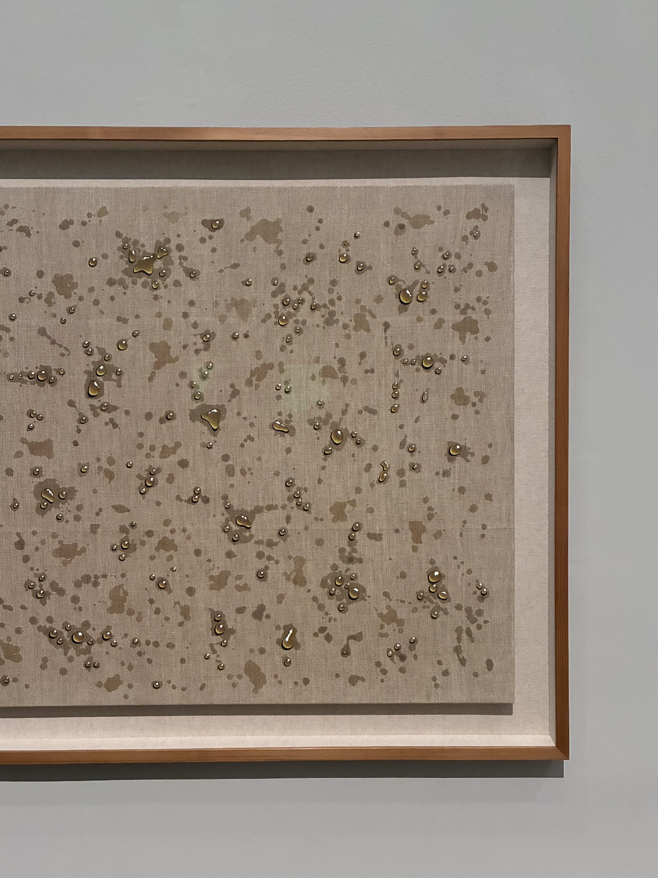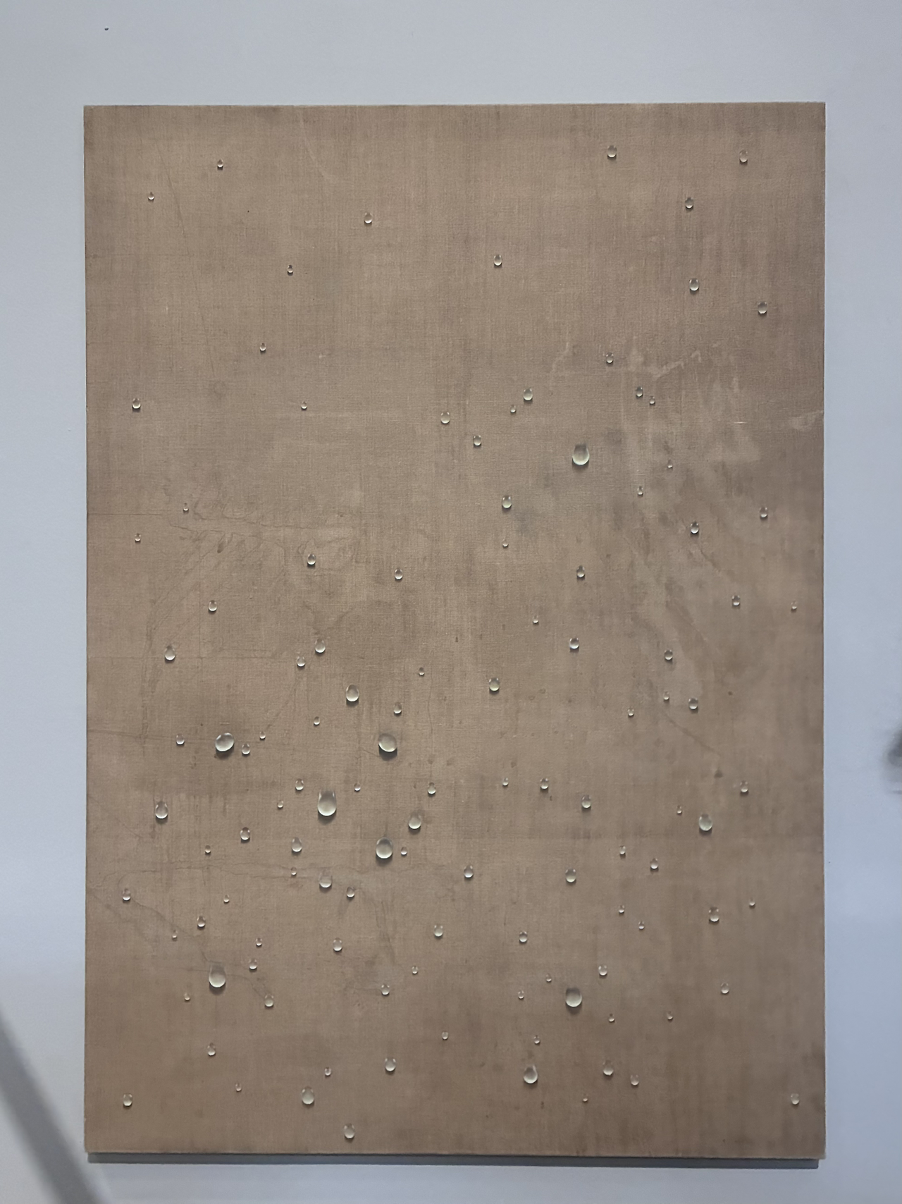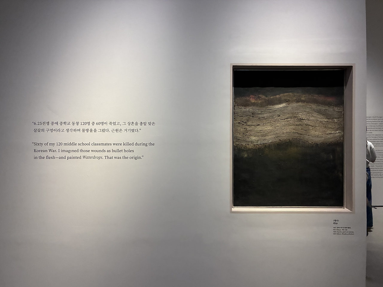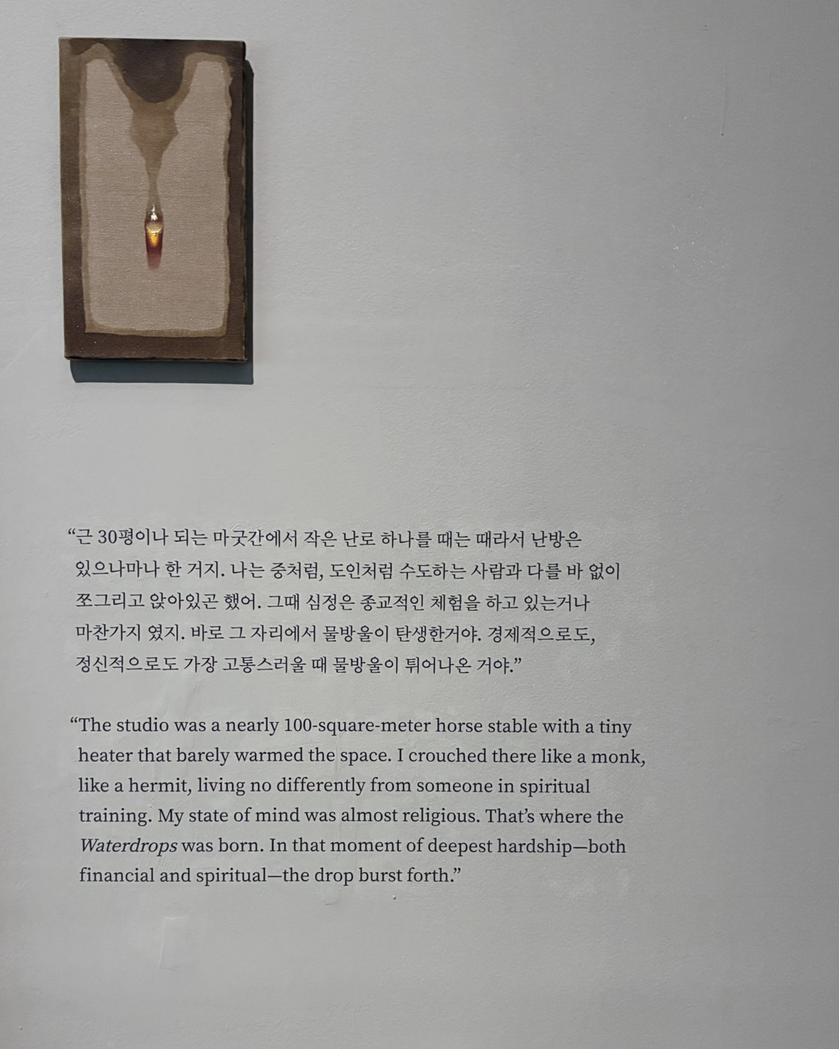 작가는 재사용하려던 캔버스 뒤에 맺힌 물방울을 보고, 그 안에서 충만한 형태의 조형성을 발견한다. 그는 이를 계기로 물방울을 화폭에 옮기기 시작했고, 이후 평생에 걸쳐 물방울을 탐구하게 된다. 김창열의 물방울은 단순한 우연의 산물이 아니라, 오랜 시간에 걸친 조형 실험과 깊은 사유 끝에 도달한 예술적 발견이었다. (*전시장 섹션 안내문 인용)