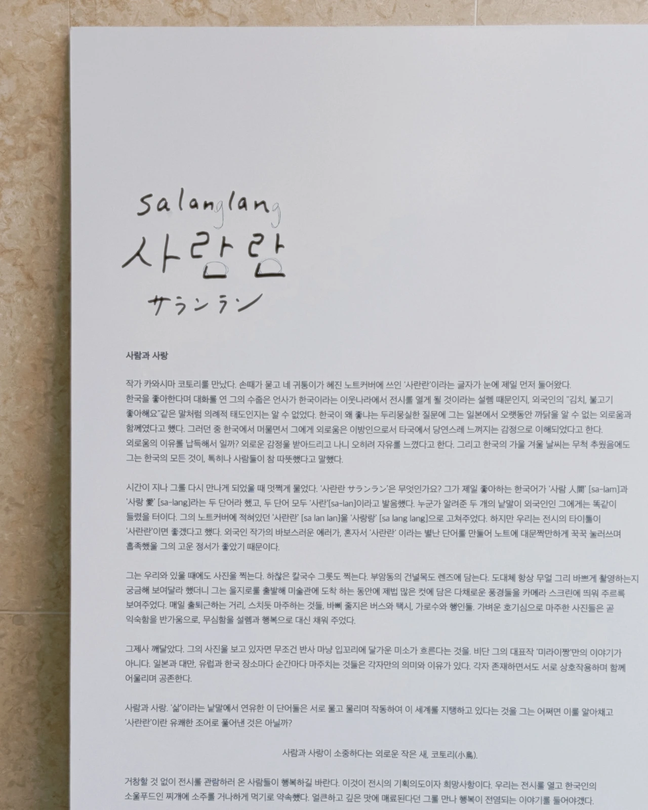 이로써 산책과 같았던 카와시마 코토리의 사진전 ≪사란란≫의 종착점에 다다랐다. 남들이 보기에 별게 아닌 것 같은 일상의 사소한 온갖 것들에 감탄하고 즐거워하는 나여서인지, 사람을 향한 작가의 소박하고도 사랑스러운 시선으로 탄생된 그 사진들에 마음이 뭉글뭉글 크게 동하였다.
