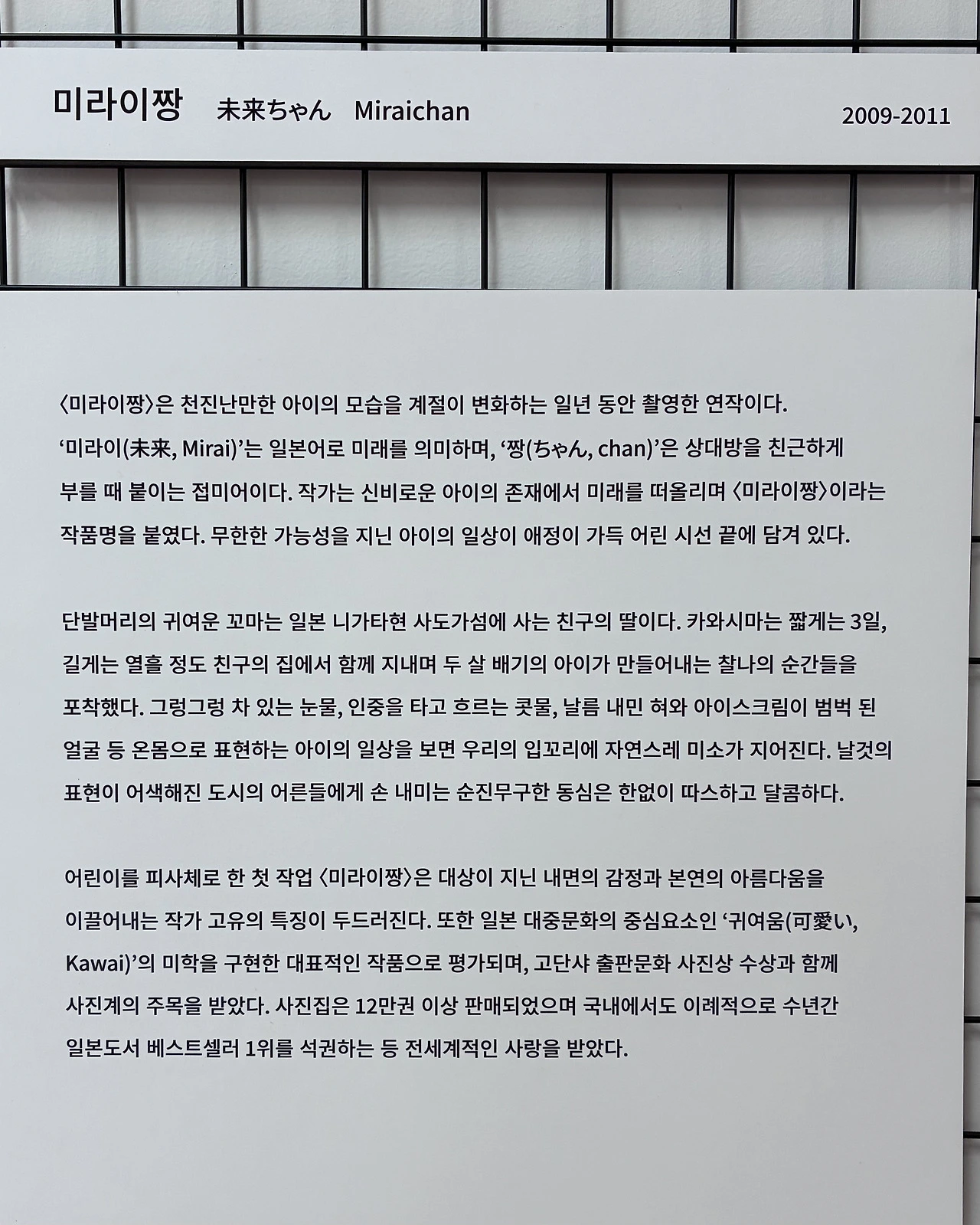 귀여운 일본인 여자아이 사진으로 유명한 미라이짱 연작도 만나볼 수 있다. 사실 이 사진을 찍은 작가가 카와시마 코토리인지 이 날 처음 알게 됐다. 워낙 유명한 사진이라 사진들만 알고 있었지 작가가 누군지는 몰랐다.