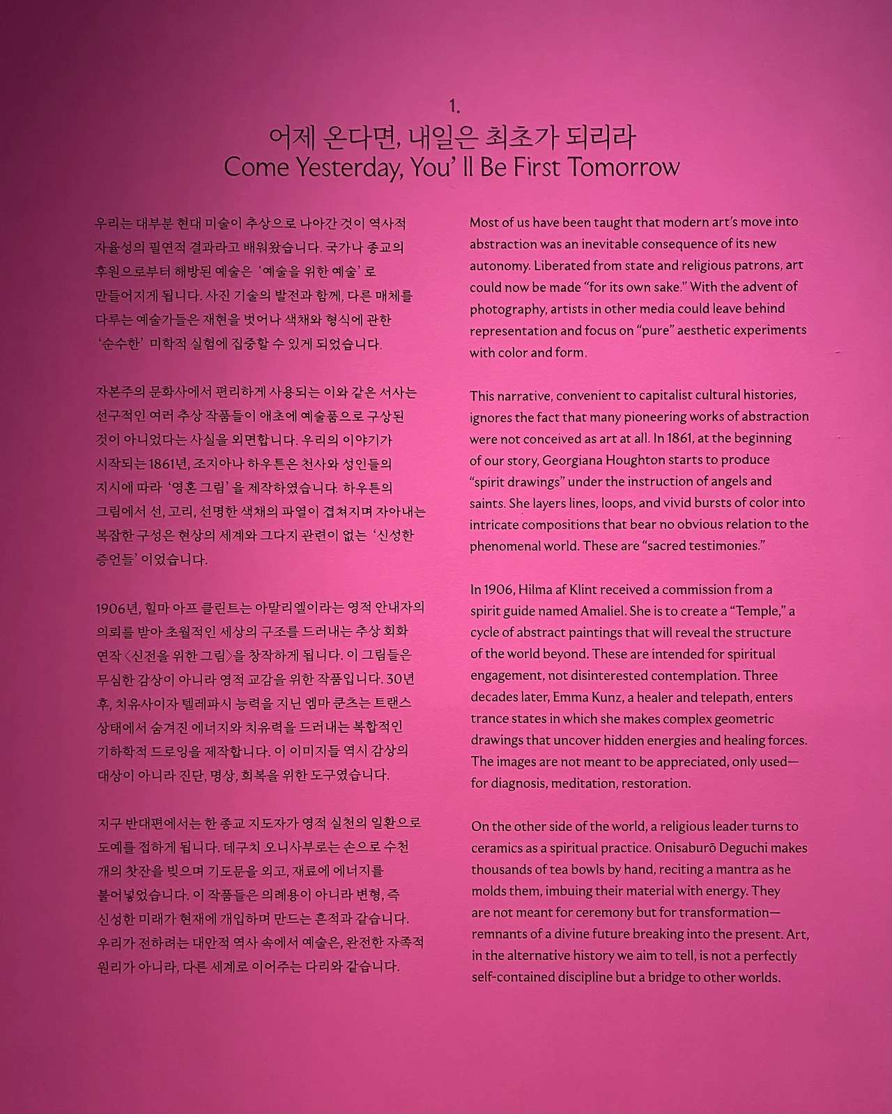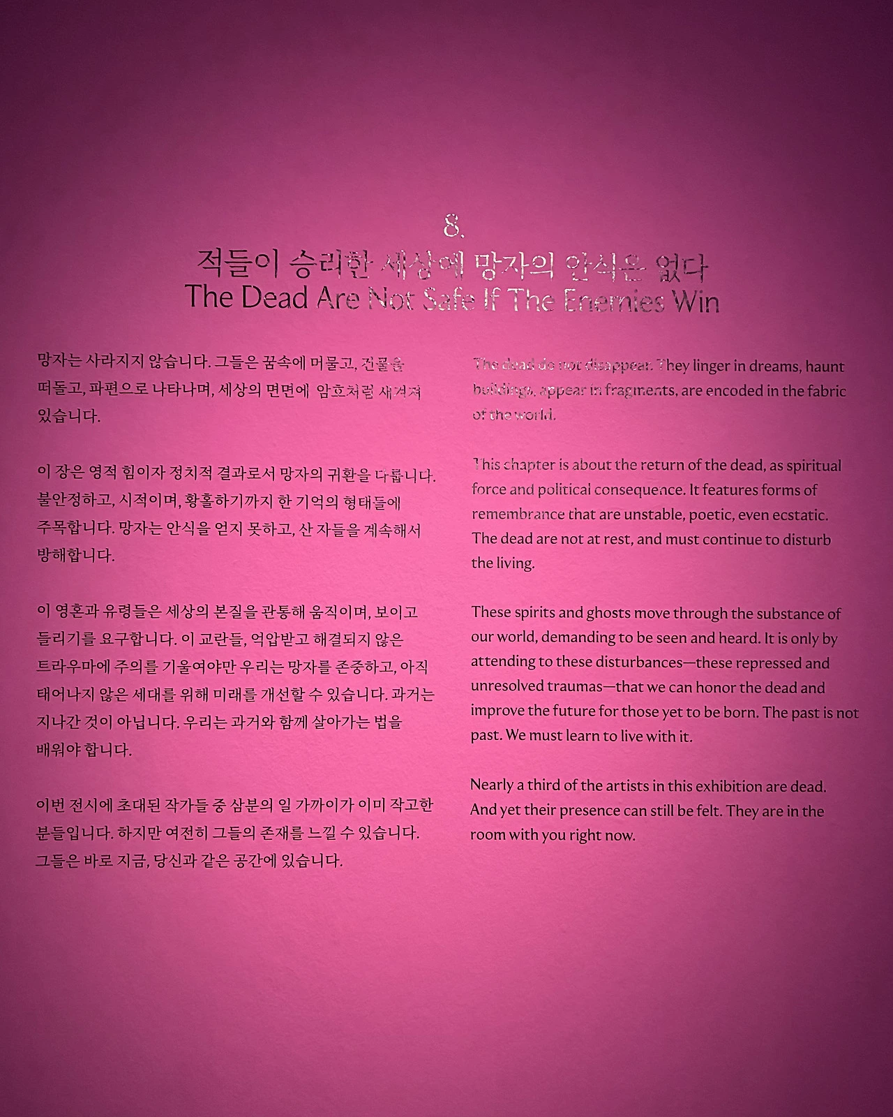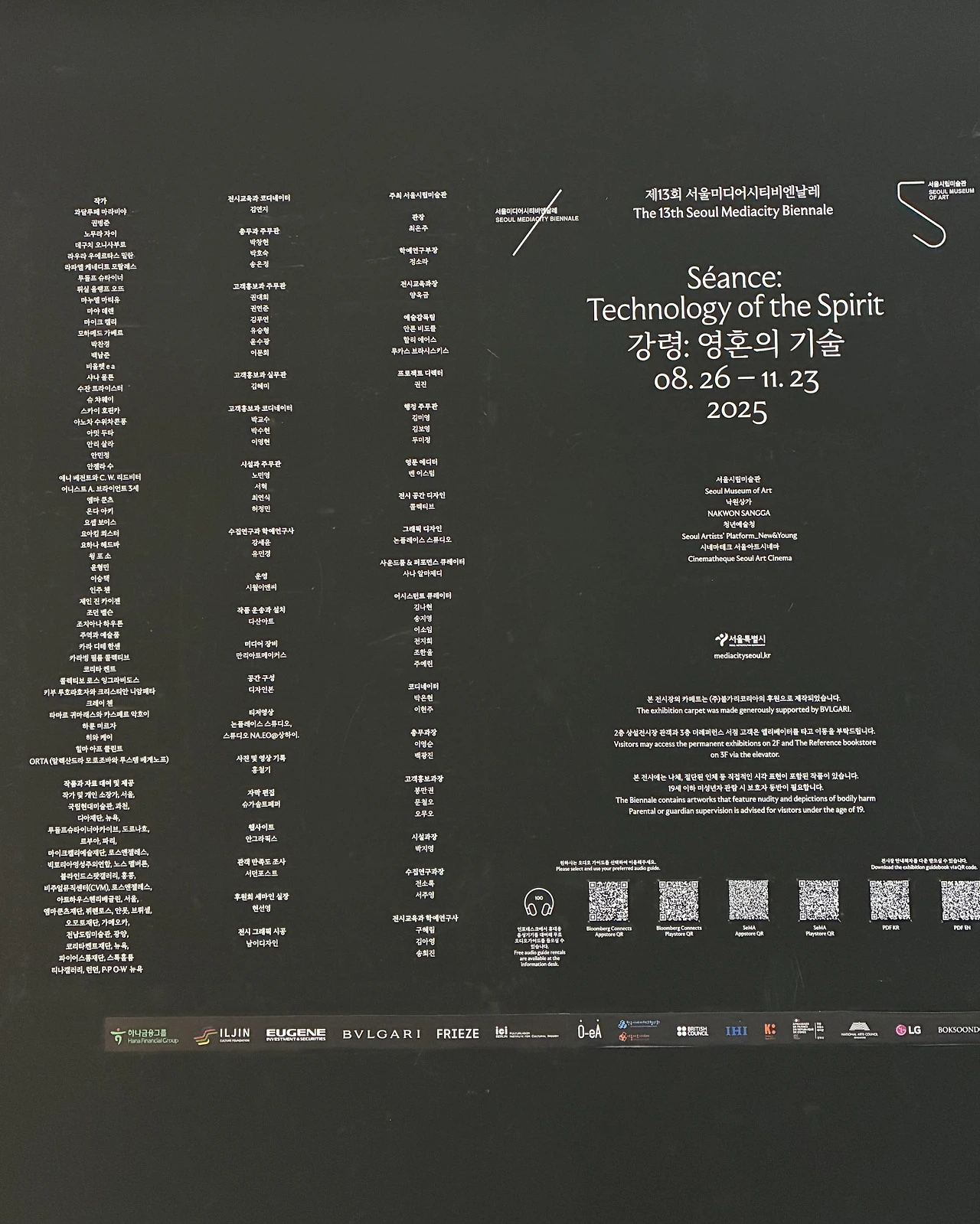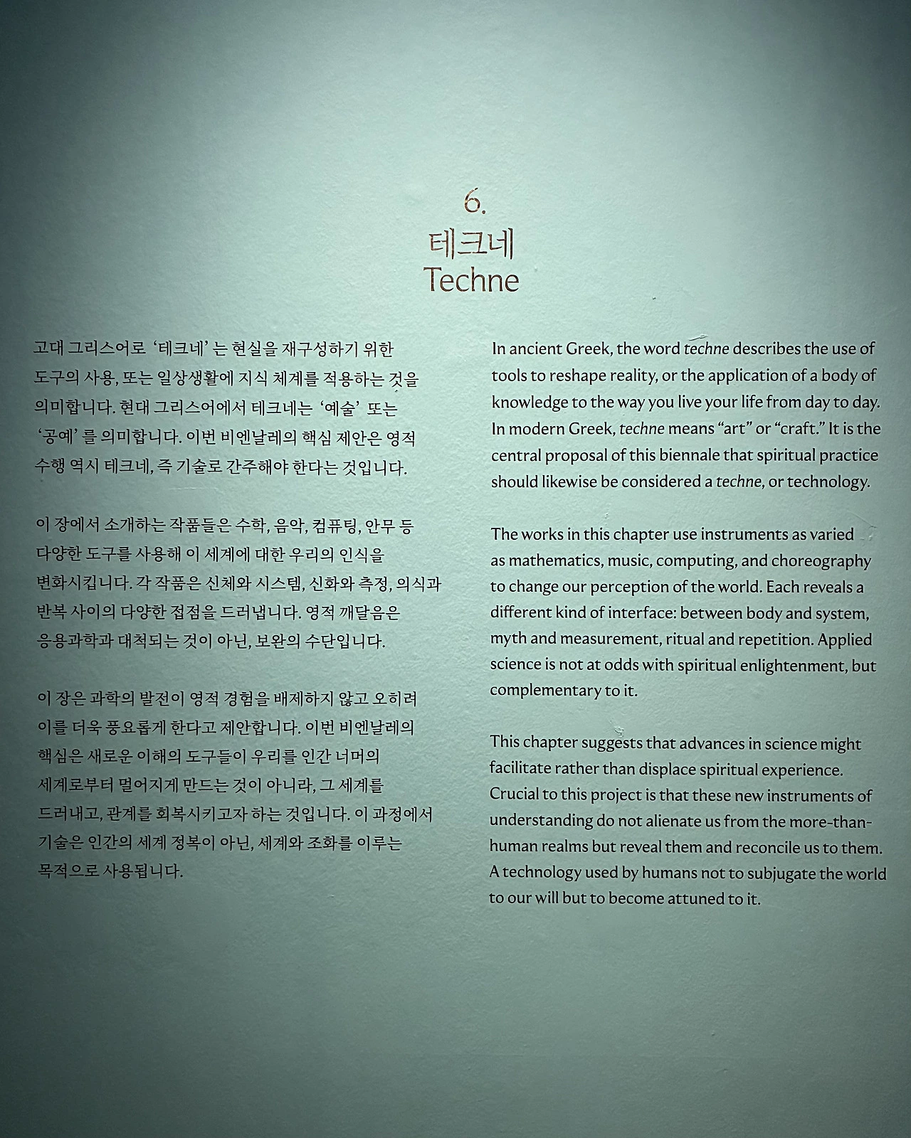 바람이 제법 을씨년스럽게 불던 어느 가을날, 그에 못지않게 을씨년스러운 분위기가 그득한 전시를 관람하였다. <강령 : 영혼의 기술>이라는 예사롭지 않은 제목을 단 이 전시는, 웹페이지의 공식 전시 설명에 의하면, 자본주의 근대성의 가속주의적이고 합리주의적인 논리와 우리의 경험을 형성하는 정치적이고 지적인 구조에 대항하고, 이를 재구성할 수 있는 대안적 '기술'로서 비엔날레를 제시하며, 깨어 있는 삶 너머 세계로 접속에 관한 오랜 열망의 역사를 바탕으로 하여 영적 세계와의 교류가 어떻게 예술창작의 언어와 방법을 변화시켜 왔는지 살펴보고자 한단다.