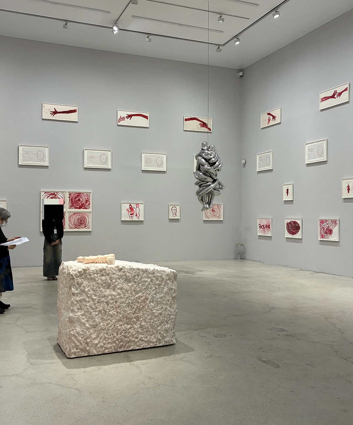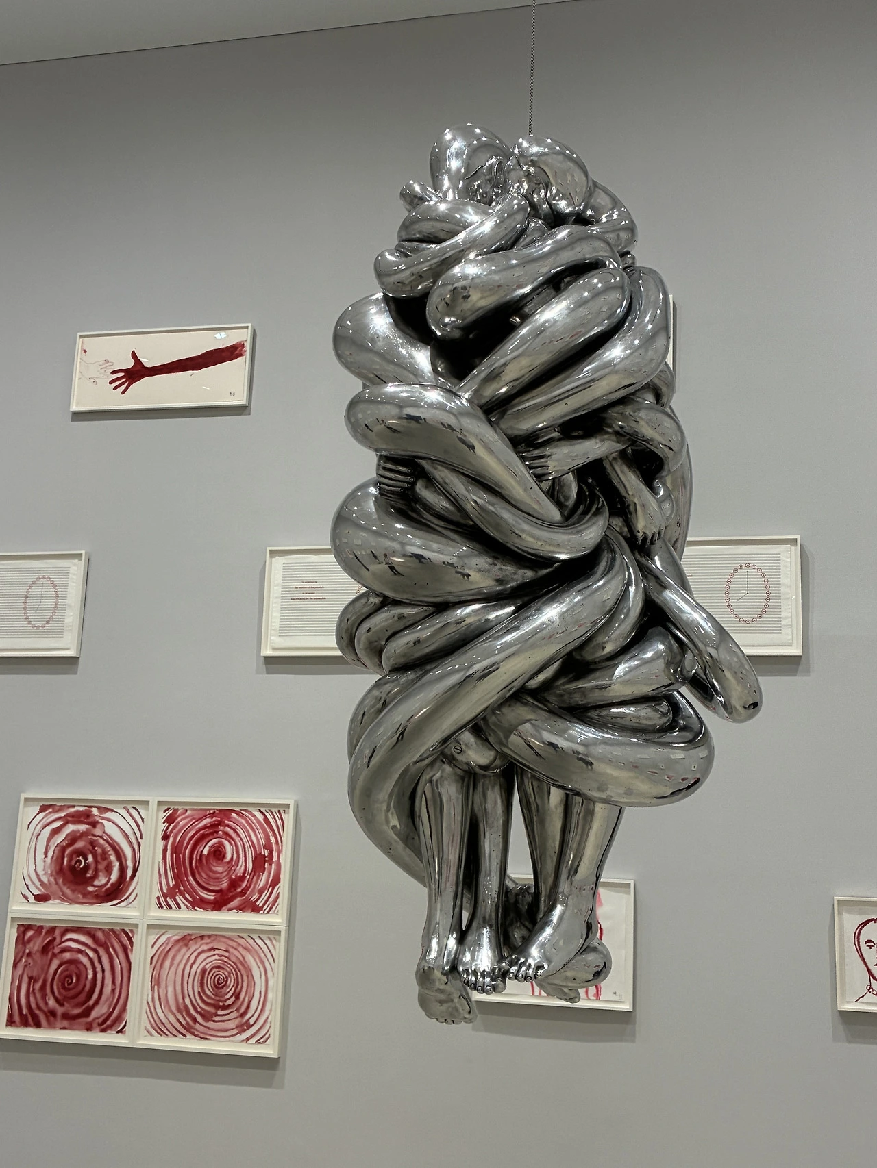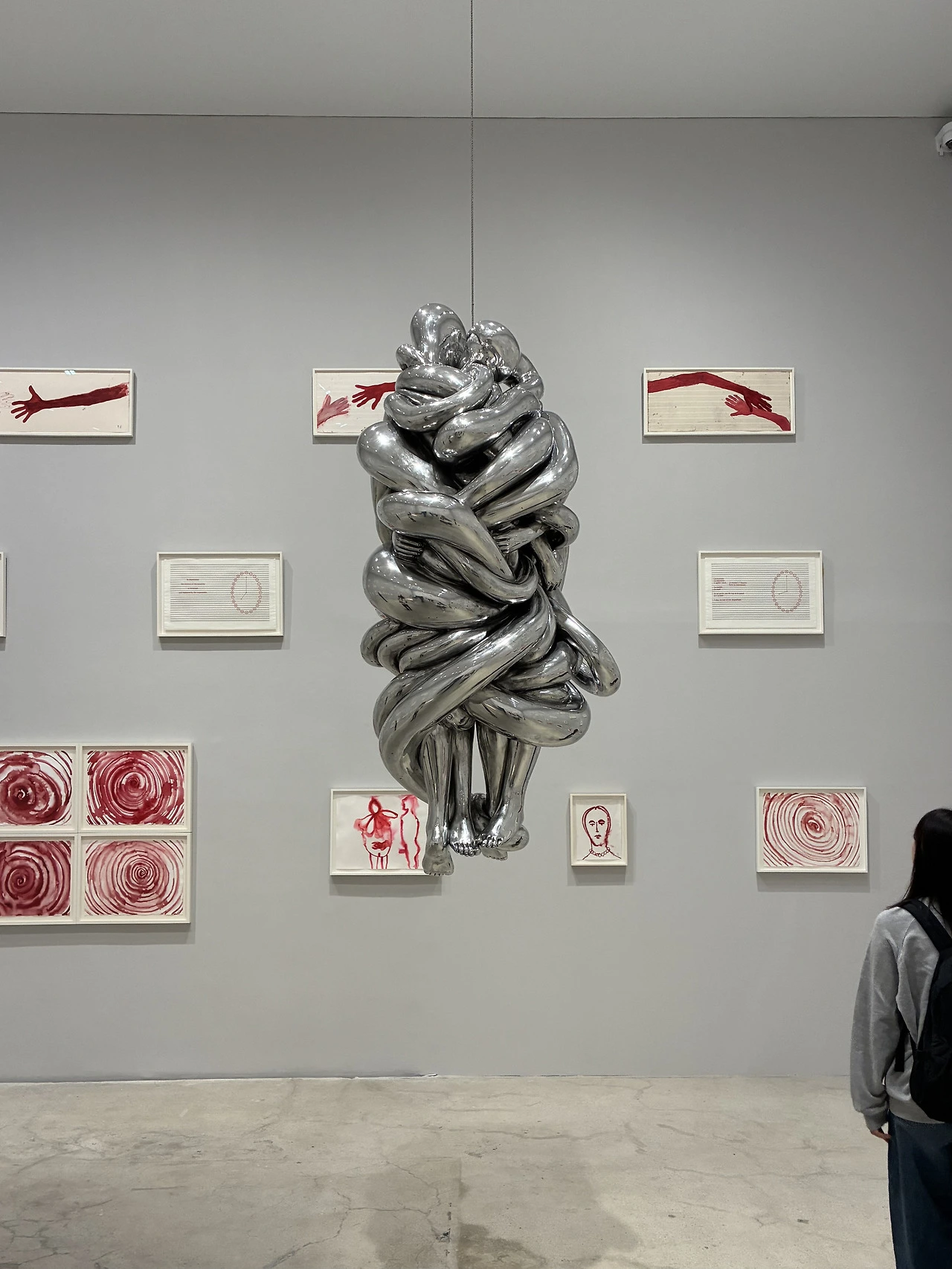 한옥을 나와 조금 더 뒤에 있는 또 다른 건물로 이동하여, 이 전시의 주제라고 할 수 있는 주요 섹션을 관람했다. 들어서자마자 강렬한 인상을 자아내는 붉은색을 사용한 그림들이 벽면 사방을 가득 메우고 있었고, 서로 부둥켜안은 채 천장에 매달려있는 두 사람 형체의 조각을 비롯한 세 점의 인상적인 조각 작품들이 놓여 있었다.