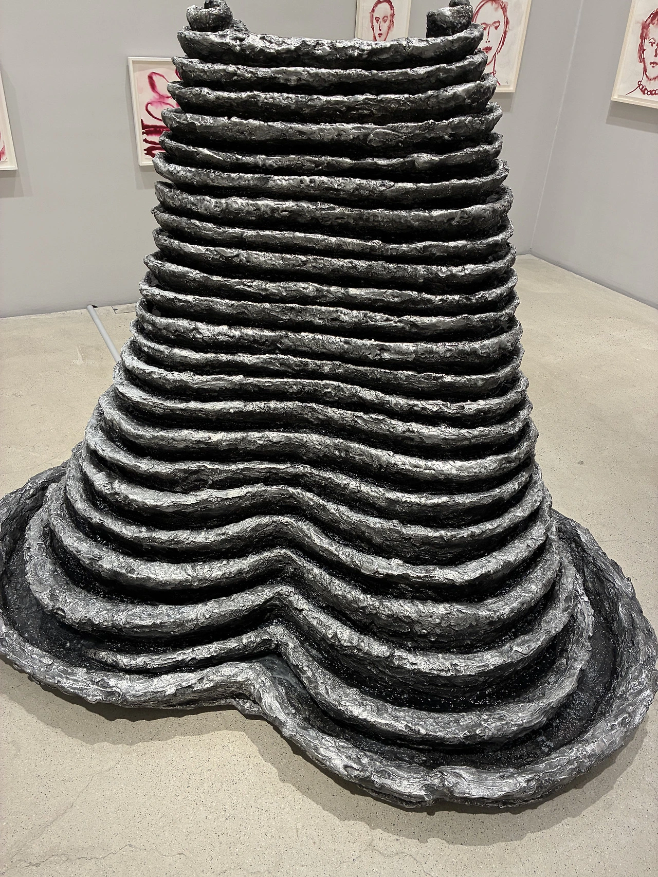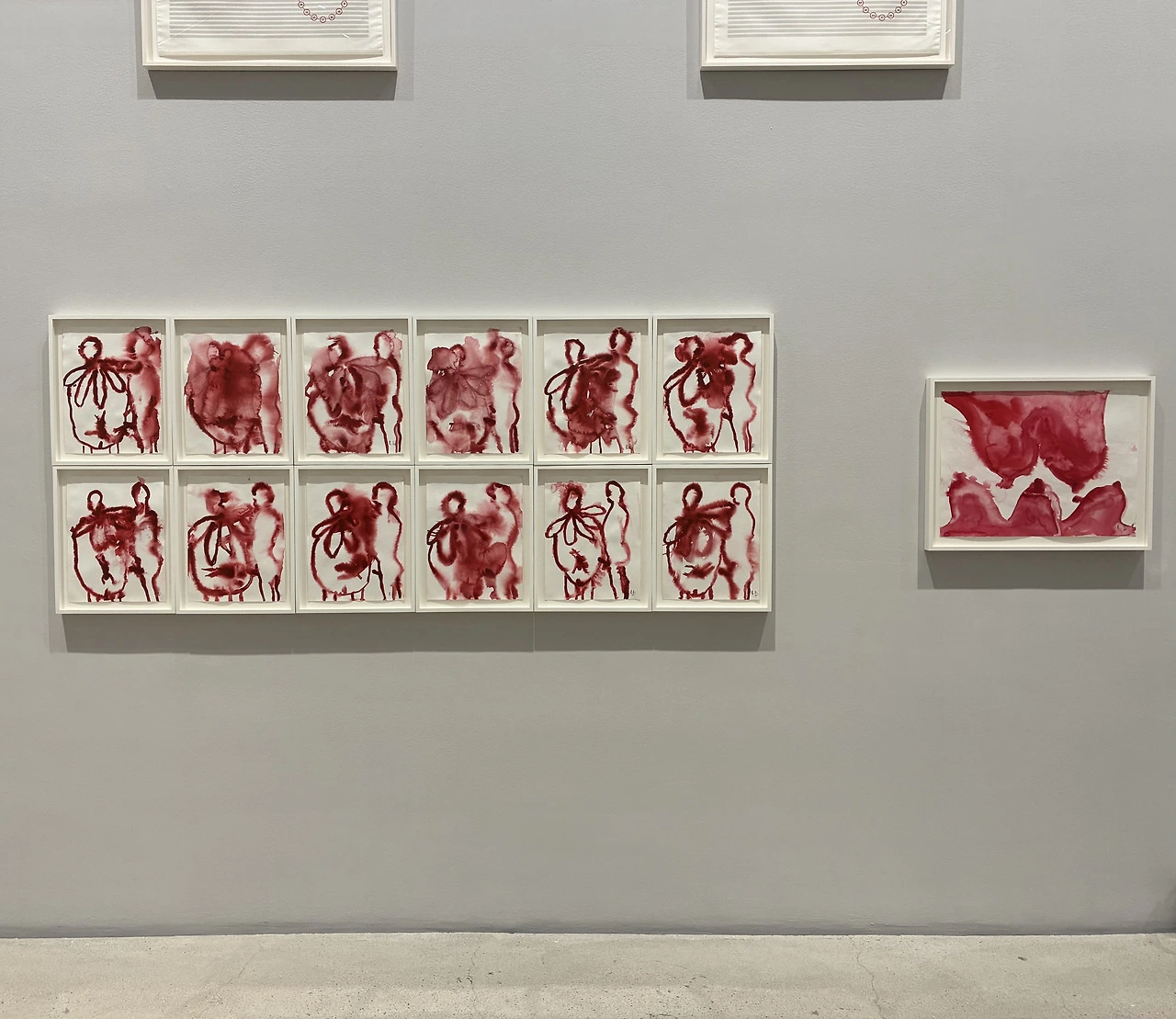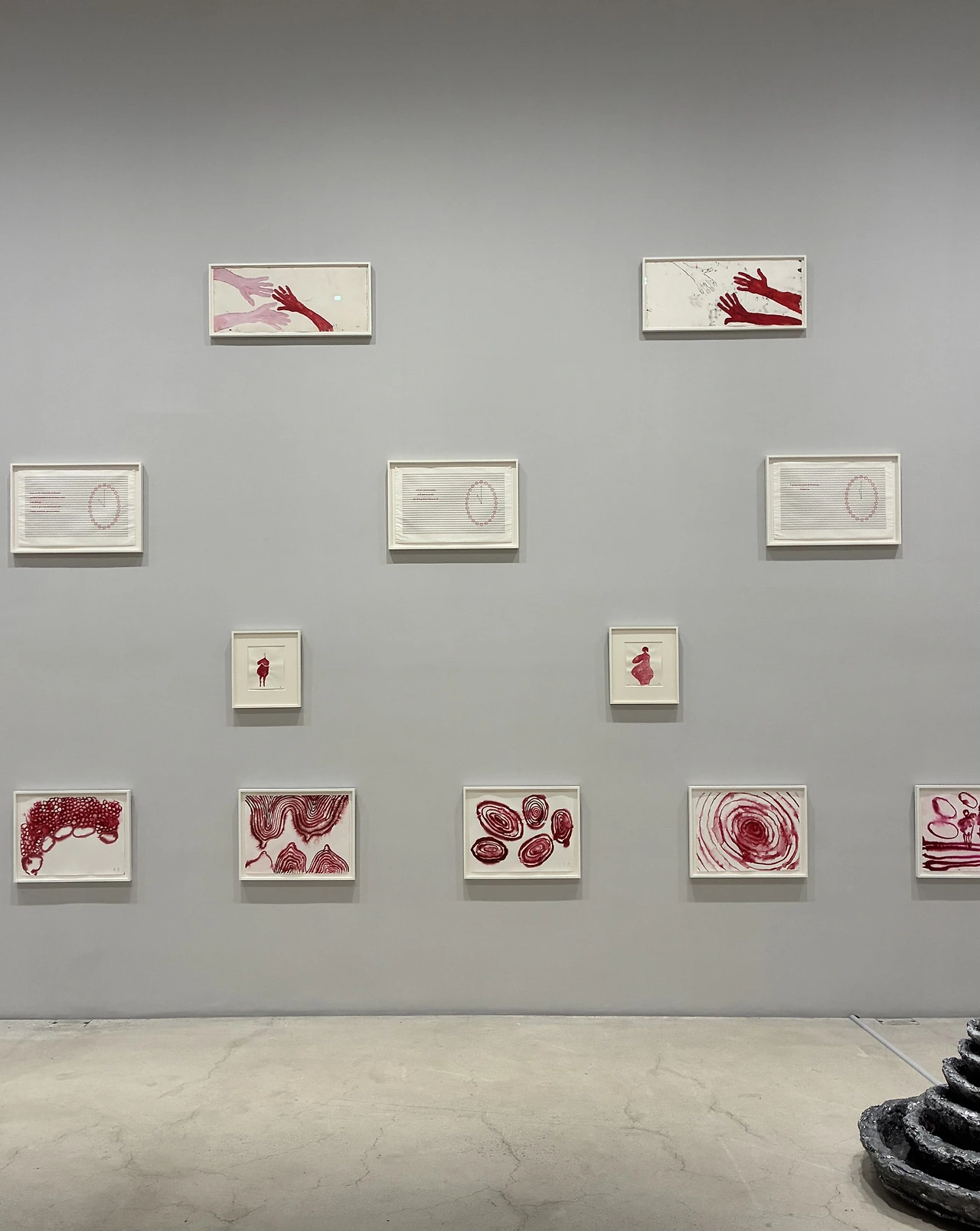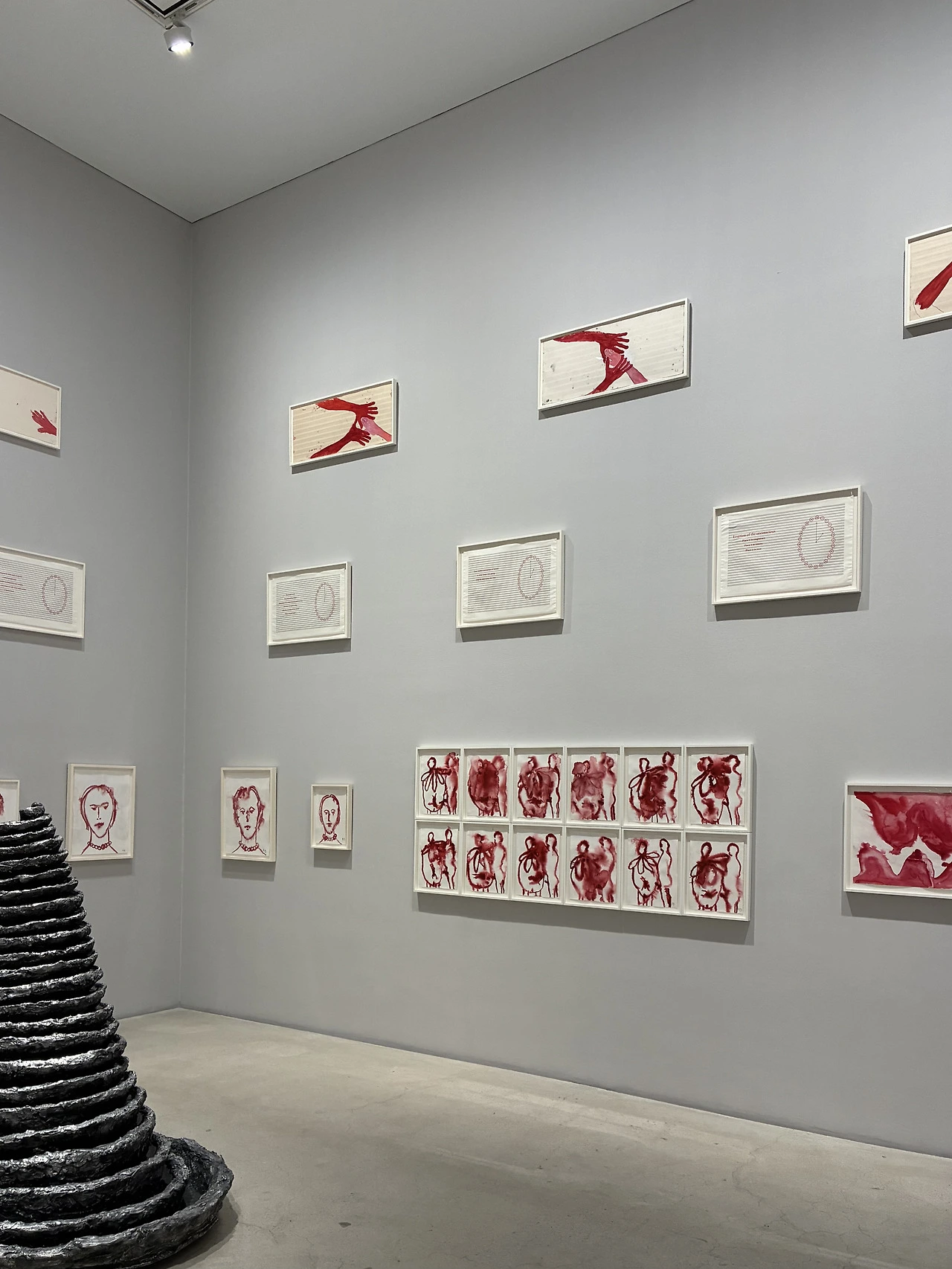한옥을 나와 조금 더 뒤에 있는 또 다른 건물로 이동하여, 이 전시의 주제라고 할 수 있는 주요 섹션을 관람했다. 들어서자마자 강렬한 인상을 자아내는 붉은색을 사용한 그림들이 벽면 사방을 가득 메우고 있었고, 서로 부둥켜안은 채 천장에 매달려있는 두 사람 형체의 조각을 비롯한 세 점의 인상적인 조각 작품들이 놓여 있었다.