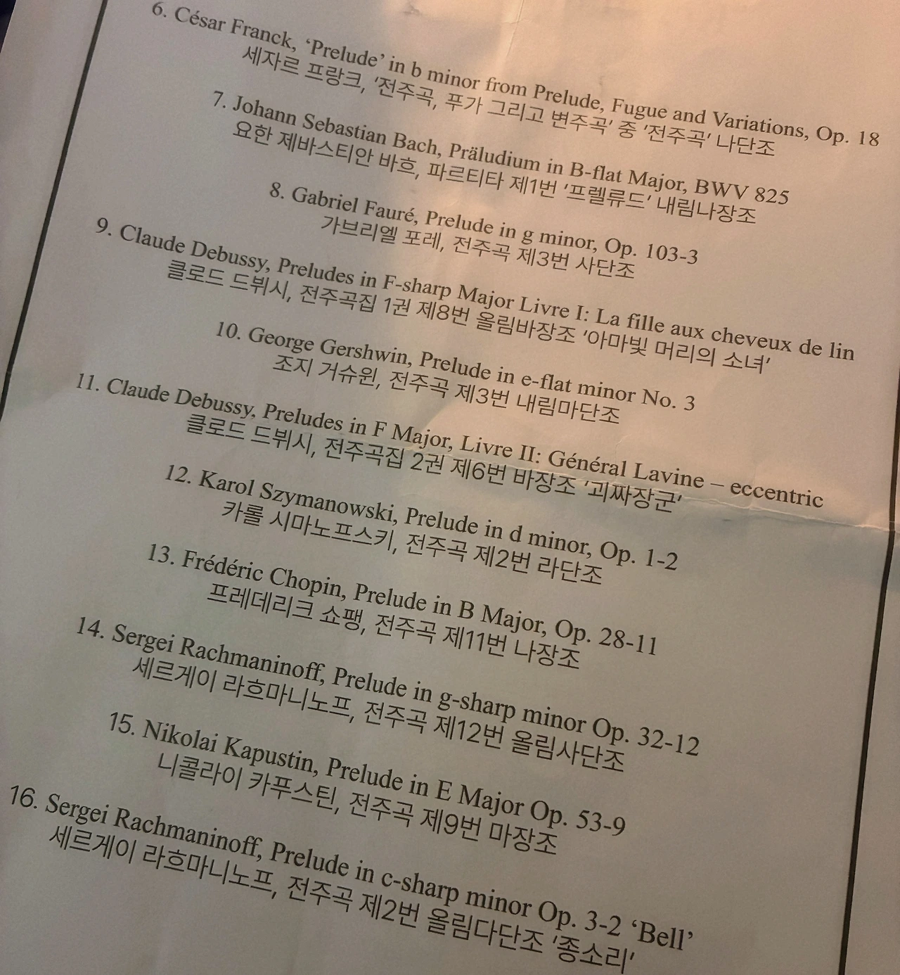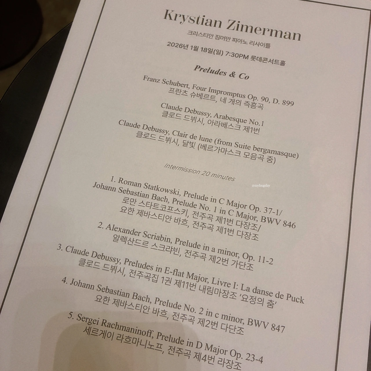 여러 가지 Preludes(전주곡)로 구성된 공연이었던 만큼 다양한 작곡가의 매우 다양한 여러 곡들이 연주되었다. 그 수많은 곡들 사이에서 오늘 공연의 최고의 곡이랍시고 감히 한 곡만 고를 수 없을 정도로 모든 곡들이 빛났고 매력적이었다. '지메르만이 지메르만했다'라고 할 정도로 연주곡들은 지메르만의 색깔을 쓴 채 각자의 위치에서 이탈하지 않고 있는 힘껏 반짝반짝 빛났다. 지메르만의 음색을 드러내면서도 지나치게 해석적이지 않고 그 와중에도 예술의 미덕인 아름다움을 결코 잊지 않은 소리였다는 말을 하고 싶은 것이다. 한 치의 오차 없는(미스터치 없는) 연주는 아니었으나 음악의 본질적인 관점에서 볼 때 가히 흠잡을 데 없는 명연주였다고 생각한다. 특히 마지막 라흐마니노프 Bell은 관객들에게 진한 여운을 남기기에 아주 훌륭한 선택이었다.
