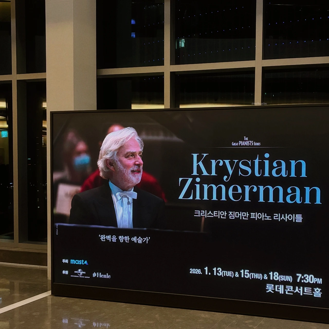 2022년 피아노 리사이틀 이후로 오랜만에 다시 찾은, Krystian Zimerman(크리스티안 지메르만)의 2026 독주회의 황홀했던 기억을 되돌아보고자 한다. 사실 2022년 독주회에서 지메르만이 보여준 연주는 물론 아주 훌륭하고 감동적이었으나 좌석 운이 별로 안 좋았던 것인지 몰라도 대단히 감명 깊지는 않았던 터라 이듬해 또다시 열린 2023년 내한 독주회 때는 참석 동기에 그다지 불이 붙지 않아 관람을 고사하였다. 그 후 한동안 내한 독주회는 없었고, 2026년에 이르러 오랜만에 이번 독주회가 열렸던 것으로 알고 있다. 그런데 이번 공연은 사전 프로그램 공지도 없었고, "당일에 오시면 알려드립니다~" 식의 진행이었던 터라 또다시 나는 공연 참석 여부를 두고 고민을 하였으나 결국 지메르만의 (지난날 아쉽게도 느끼지 못했던) 명연주를 감상하고 싶어 예매를 결심했다. 수많은 동기들이 작용하여 결국엔 이 연주회에 가도록 최종 결정을 내렸다는 사실이 새삼 신기하고 제법 운명적으로 느껴졌다. 왜냐하면 금년도 연주는 정말이지 너무나도 황홀하고 멋진 경험이었기 때문이다. 세상에 '음악'이라는 이토록 아름다운 것이 존재하는데 삶이 가히 아름답지 않을 수가 있겠나, 이 앞에서 고통이나 번뇌 따위란 참으로 무상하기 그지없구나 싶은 생각이 들 정도로 아름다운 음악의 시간이었다. 비통하게도 내 왼편에 앉은 남성 관객의 시종일관 관객 매너 없는 모습으로 방해를 받기는 하였으나 일부러 그를 보지 않으려고 눈을 감아 버렸더니 오히려 음악이라는 은하수를 타고 거대한 상상의 우주를 유영하는 듯한 경험을 할 수 있었다.
