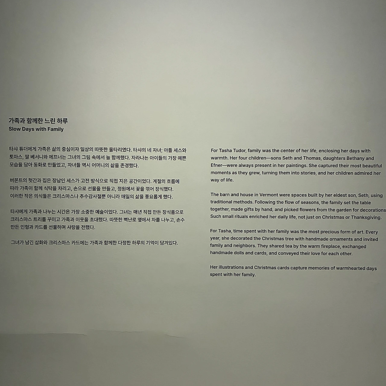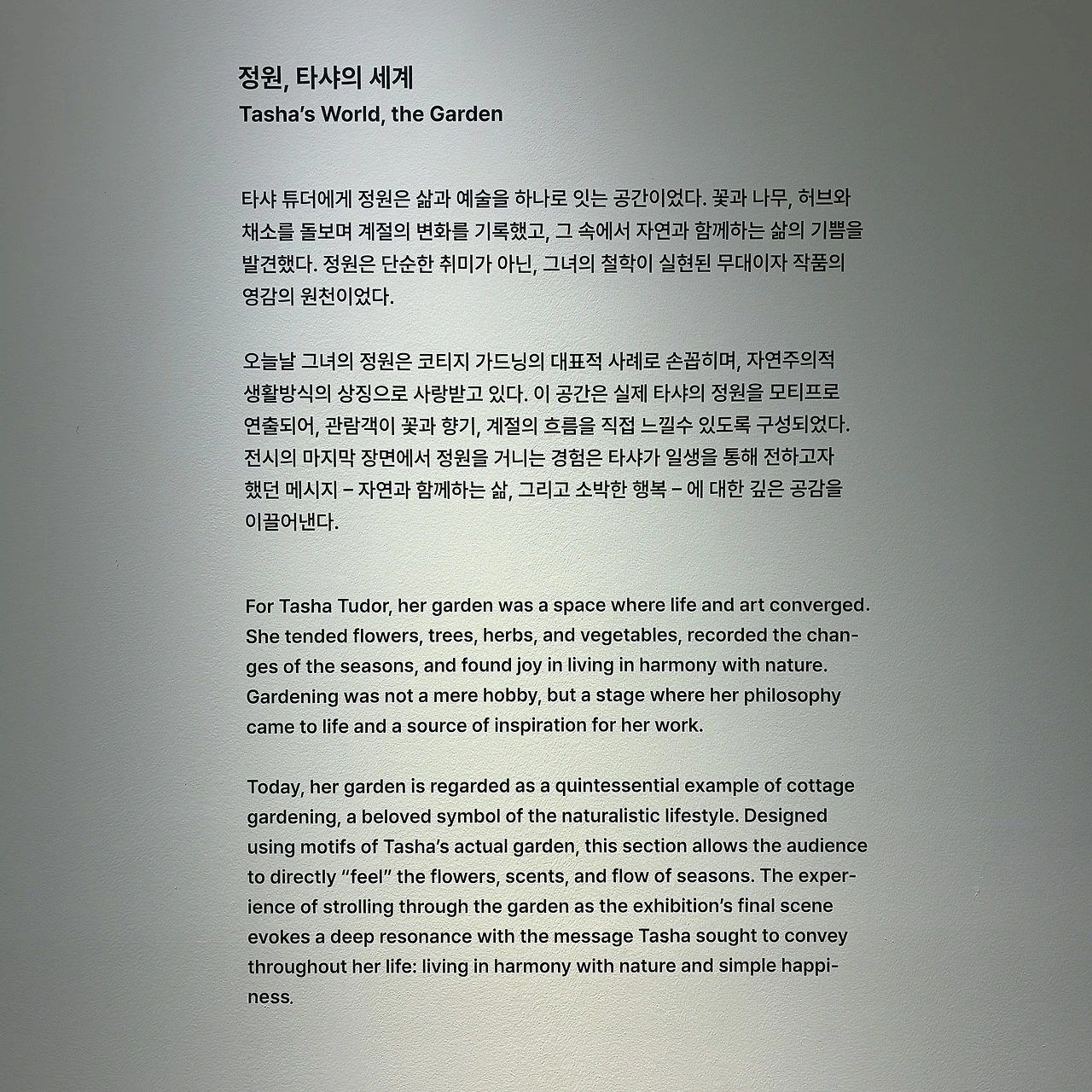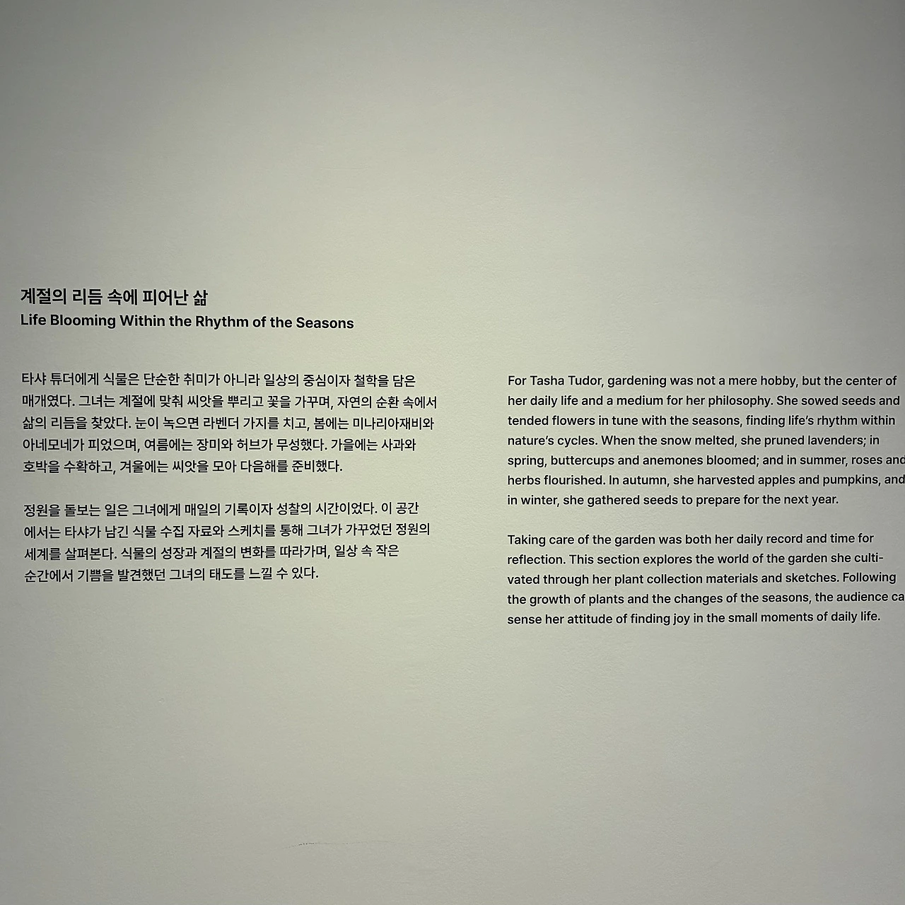 새로운 직장에서의 너무 많은 업무와, 날이 갈수록 점점 더 번잡하고 삭막해져만 가는 도시의 모습 속에서 한창 지쳐있던 때, <Still, Tasha Tudor> 전시를 관람했다. 동화 작가이자 삽화가였던 그녀의 그림들을 그녀의 삶의 철학과 연관 지어 소개하는 따뜻하고 몽글몽글한 전시였고, 가벼운 마음으로 방문한 전시였는데 예상외의 깊은 울림을 내게 전해 주었다.