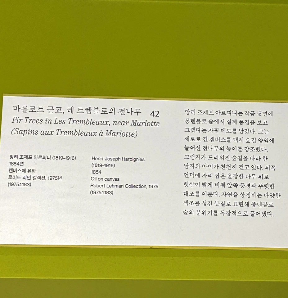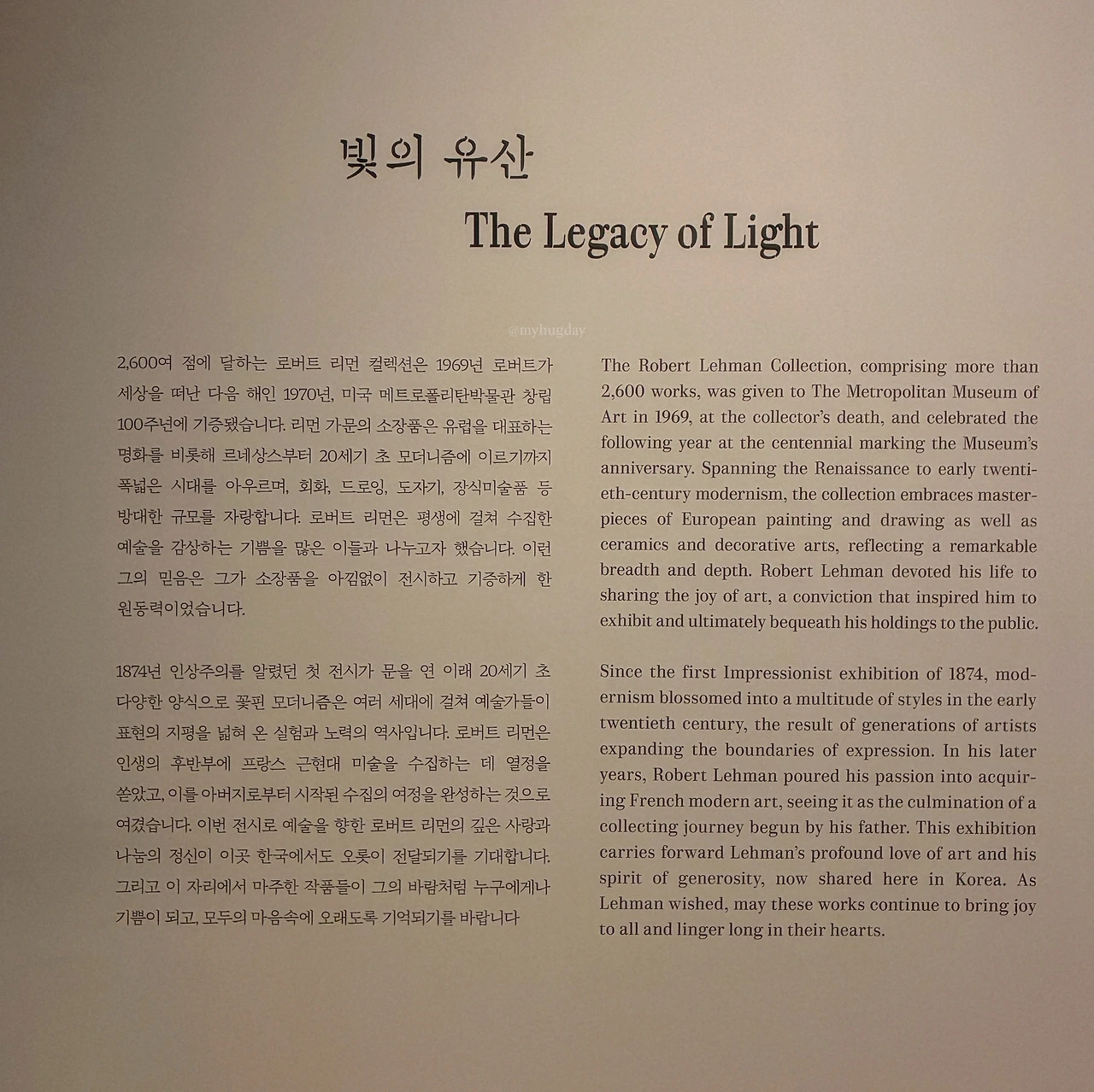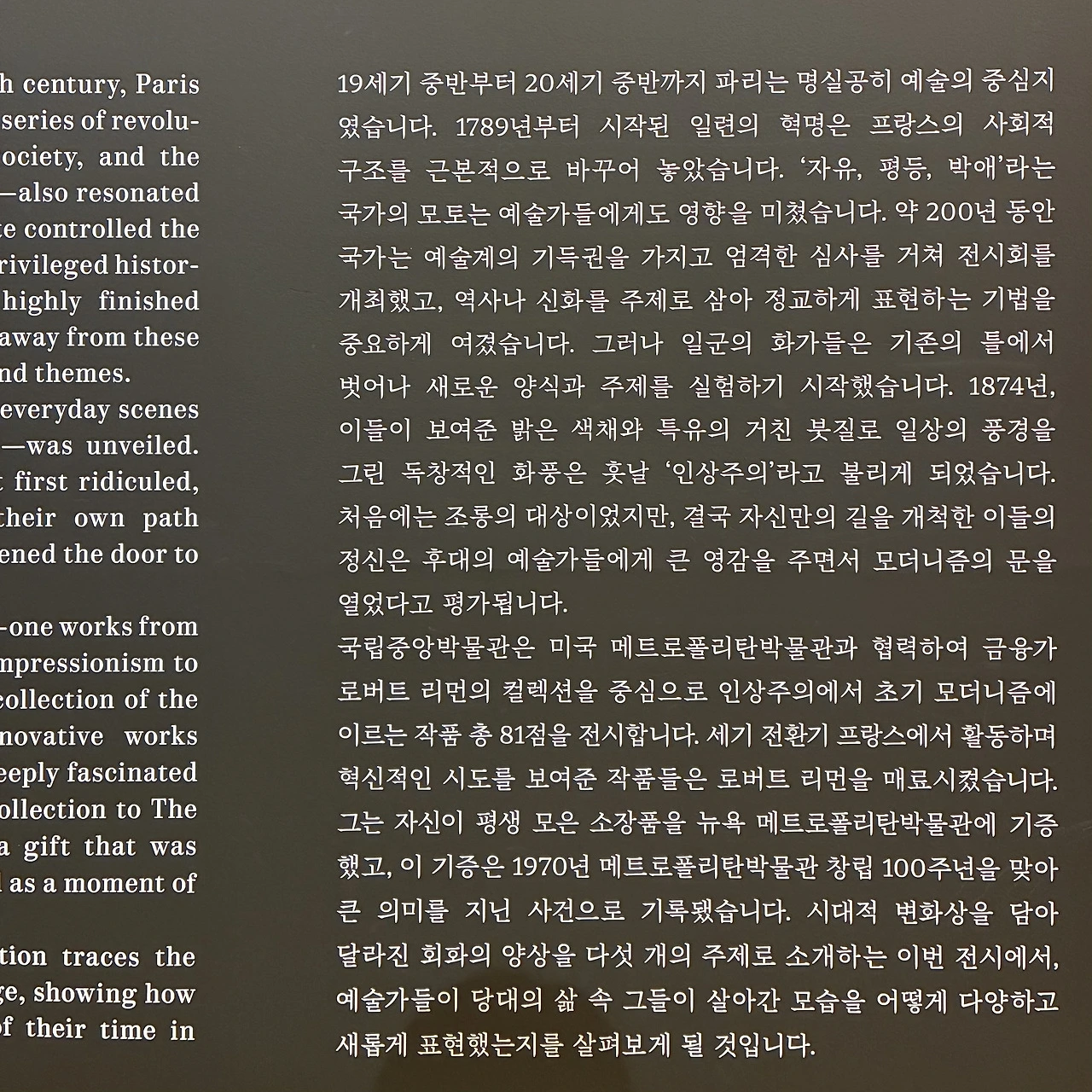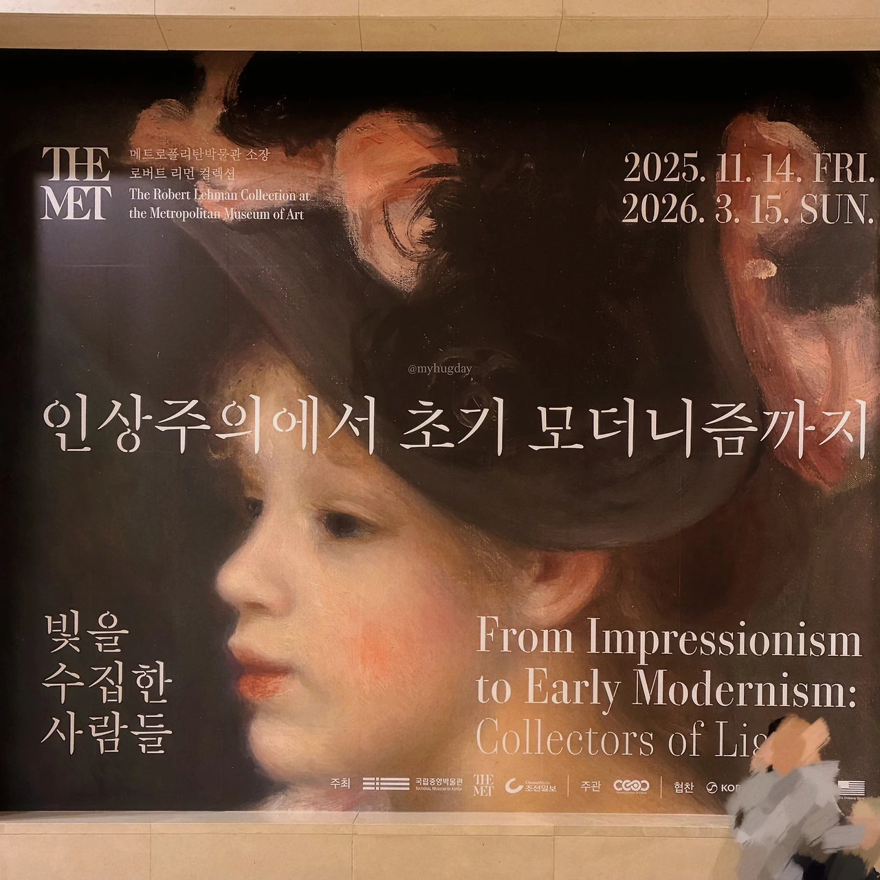 2025년 대한민국은 마치 인상주의 미술의 해이기라도 한 것처럼 정말 온 미술관에서 너도나도 인상주의 작품 전시회가 열렸다. 보고 또 보아도 좋은, 멋진 작품들이지만 솔직히 조금 당황스러울 만큼 여기저기 온 동네가 '인상주의'라는 문구로 가득한 한 해였어서, 보통 한 전시를 두 번 이상 가는 편인 내가 작년 전시들은 죄다 한 번씩만 보고 말 정도였다. 그러나 구시렁거리면서도 동네방네 인상주의 전시들을 참 성실히도 찾아다녔다. 이 전시 또한 '인상주의' 키워드를 내건 전시로, 국립중앙박물관에서 미국 메트로폴리탄박물관으로부터 공수해 온 로버트 리먼 컬렉션이다. 로버트 리먼 컬렉션에 대한 내용은 바로 아래에 첨부한 전시안내문 사진에 나와 있으니 참고하시기 바란다.