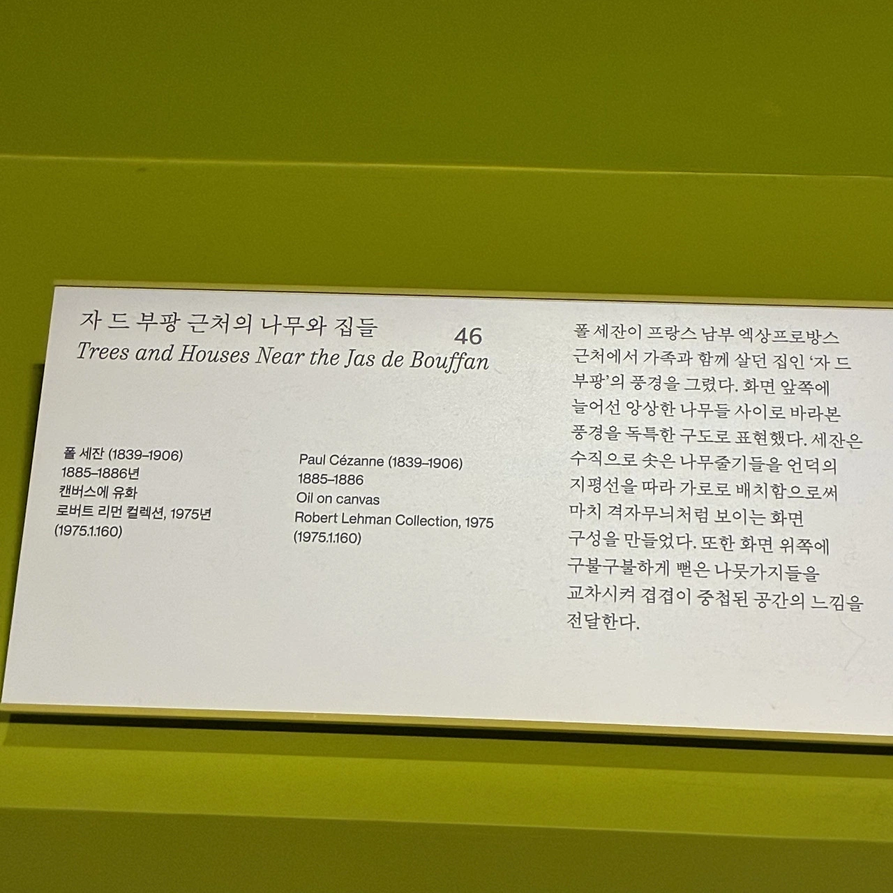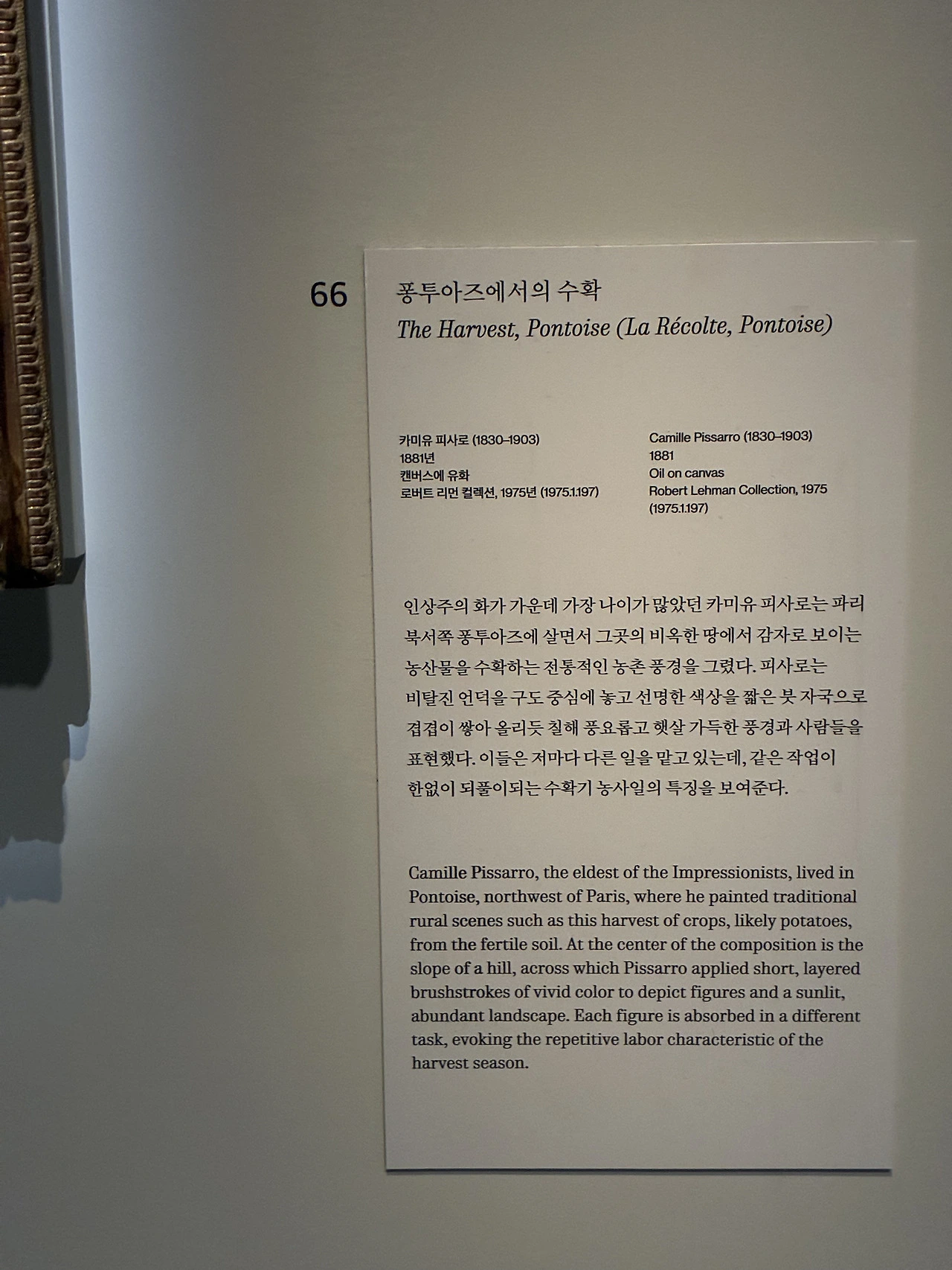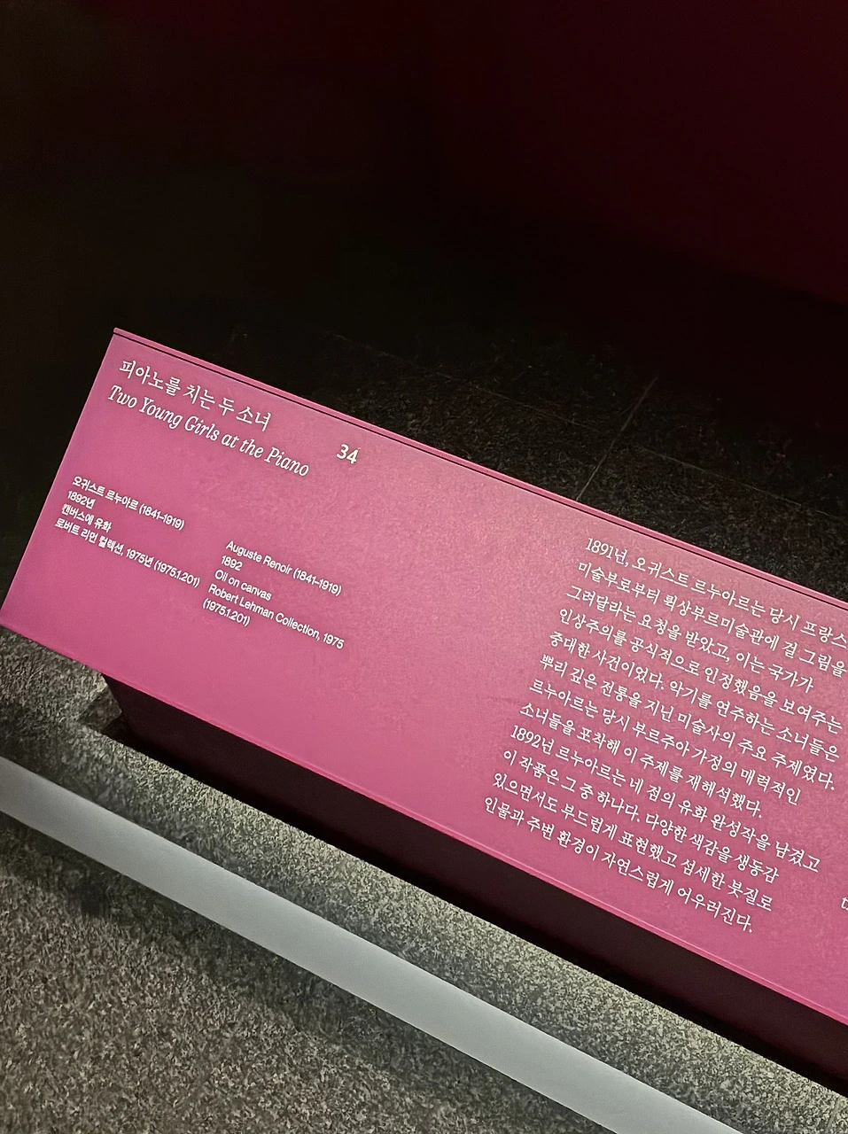 2025년 대한민국은 마치 인상주의 미술의 해이기라도 한 것처럼 정말 온 미술관에서 너도나도 인상주의 작품 전시회가 열렸다. 보고 또 보아도 좋은, 멋진 작품들이지만 솔직히 조금 당황스러울 만큼 여기저기 온 동네가 '인상주의'라는 문구로 가득한 한 해였어서, 보통 한 전시를 두 번 이상 가는 편인 내가 작년 전시들은 죄다 한 번씩만 보고 말 정도였다. 그러나 구시렁거리면서도 동네방네 인상주의 전시들을 참 성실히도 찾아다녔다. 이 전시 또한 '인상주의' 키워드를 내건 전시로, 국립중앙박물관에서 미국 메트로폴리탄박물관으로부터 공수해 온 로버트 리먼 컬렉션이다. 로버트 리먼 컬렉션에 대한 내용은 바로 아래에 첨부한 전시안내문 사진에 나와 있으니 참고하시기 바란다.
