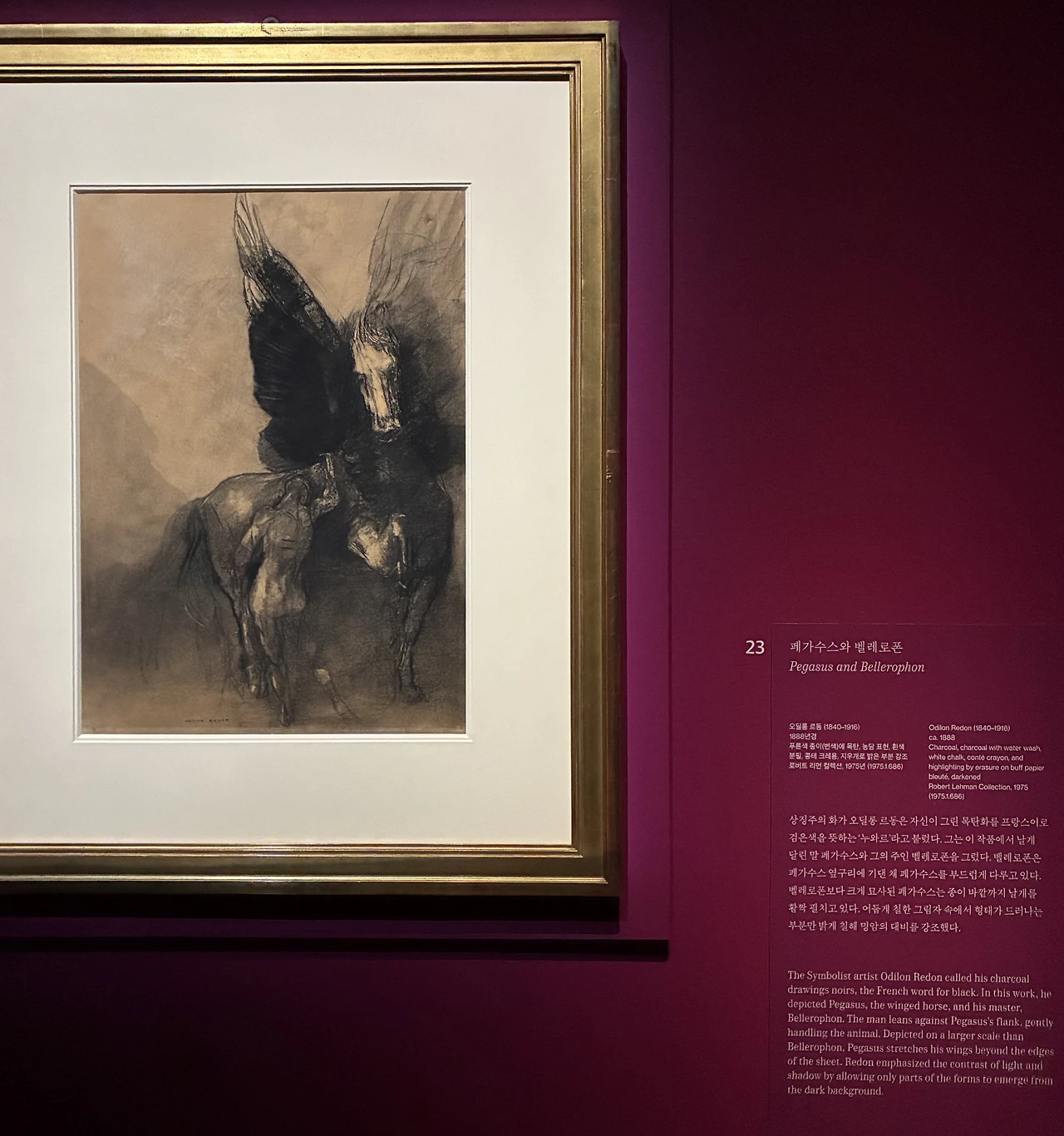 페가수스와 벨레로폰을 그린 르동의 이 작품은 페가수스를 아주 멋지게 표현한 점과, 페가수스로 상징되는 도약과 상승, 자유, 힘의 이미지를 통해 그림으로부터 전해지는 긍정적인 에너지가 좋아서 찍어 두었다. 그림 속 벨레로폰의 모습은 추락의 순간이 아닌 도약의 순간으로 묘사되어 있어 그림을 보는 것만으로도 심장이 두근거리는 듯했다. 오, 물론 명암 묘사도 멋지고 말이다.