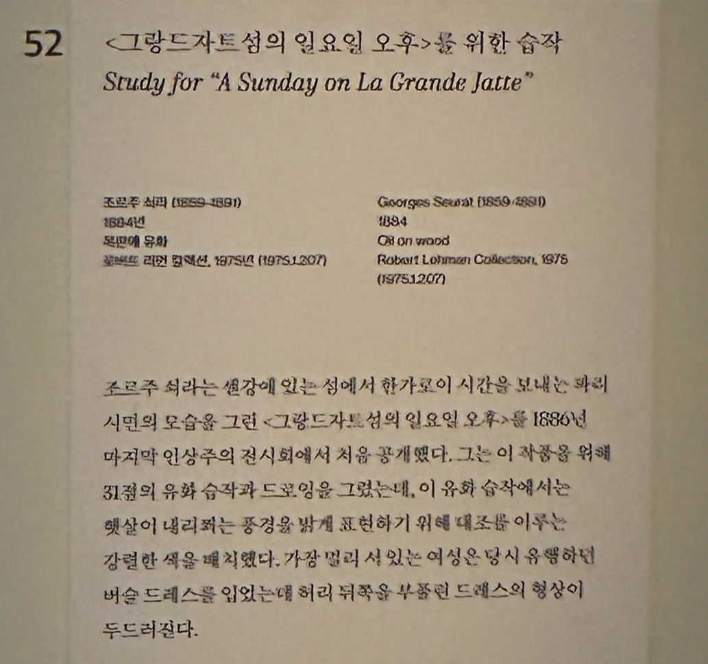 우리가 흔히 알고 있는 Seurat(쇠라)의 <그랑자트섬의 일요일 오후>, 그것을 완성하기 위한 습작을 이번 전시에서 만나볼 수 있다.