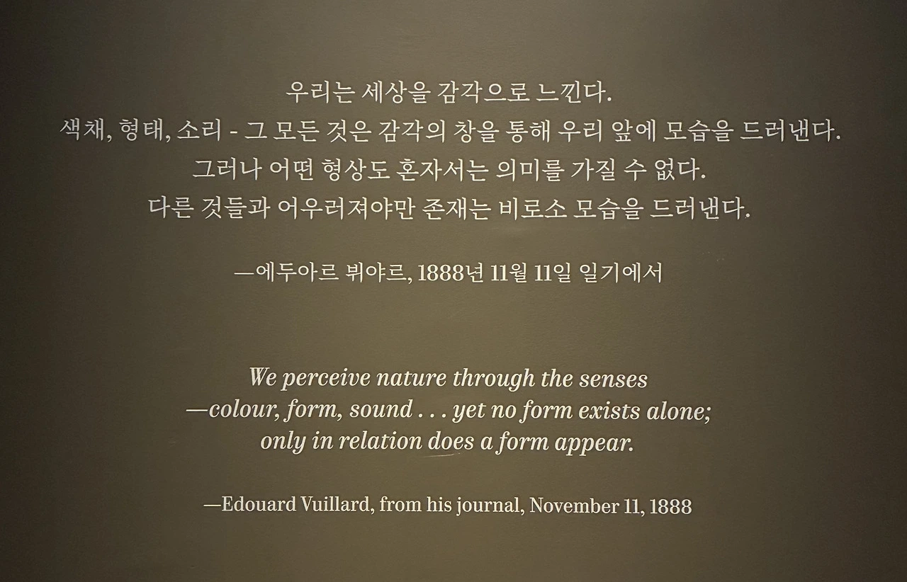 Vuillard(뷔야르)의 다음 말은 꽤 철학적으로 다가온다. 감각을 통해 세상을 느끼고, '감각의 창을 통해' 모습을 드러내며, 관계 속에서 의미를 지닌다는 뷔야르의 한마디는, 결국 우리가 감각기관을 통하여 받아들이는 세계의 모든 것은 우리의 사고와 인식을 통해서 재편성되고 해석되어 최종 모습으로 만들어지는 것이고, 그에 사용되는 사고와 인식이란 것은 한 인간으로서 집단 내외 다른 인간들과 수없이 얽혀있는 다양한 관계 속에서 학습하며 형성된 것이라는 점, 결국 우리는 근본적으로 관계를 벗어날 수 없는 사회적 동물이라는 점을 모두 담고 있는 듯하다.