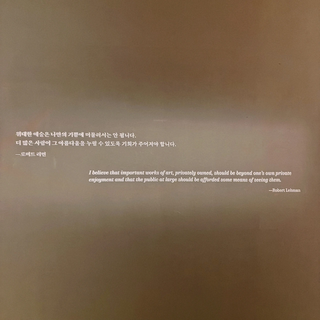 "위대한 예술은 나만의 기쁨에 머물러서는 안 됩니다. 더 많은 사람이 그 아름다움을 누릴 수 있도록 기회가 주어져야 합니다."라며 이토록 양질의 우수한 예술작품들을 함께 나누어 준 Robert Lehman에게 깊은 감사를 전하며 이 전시 감상기를 마친다.